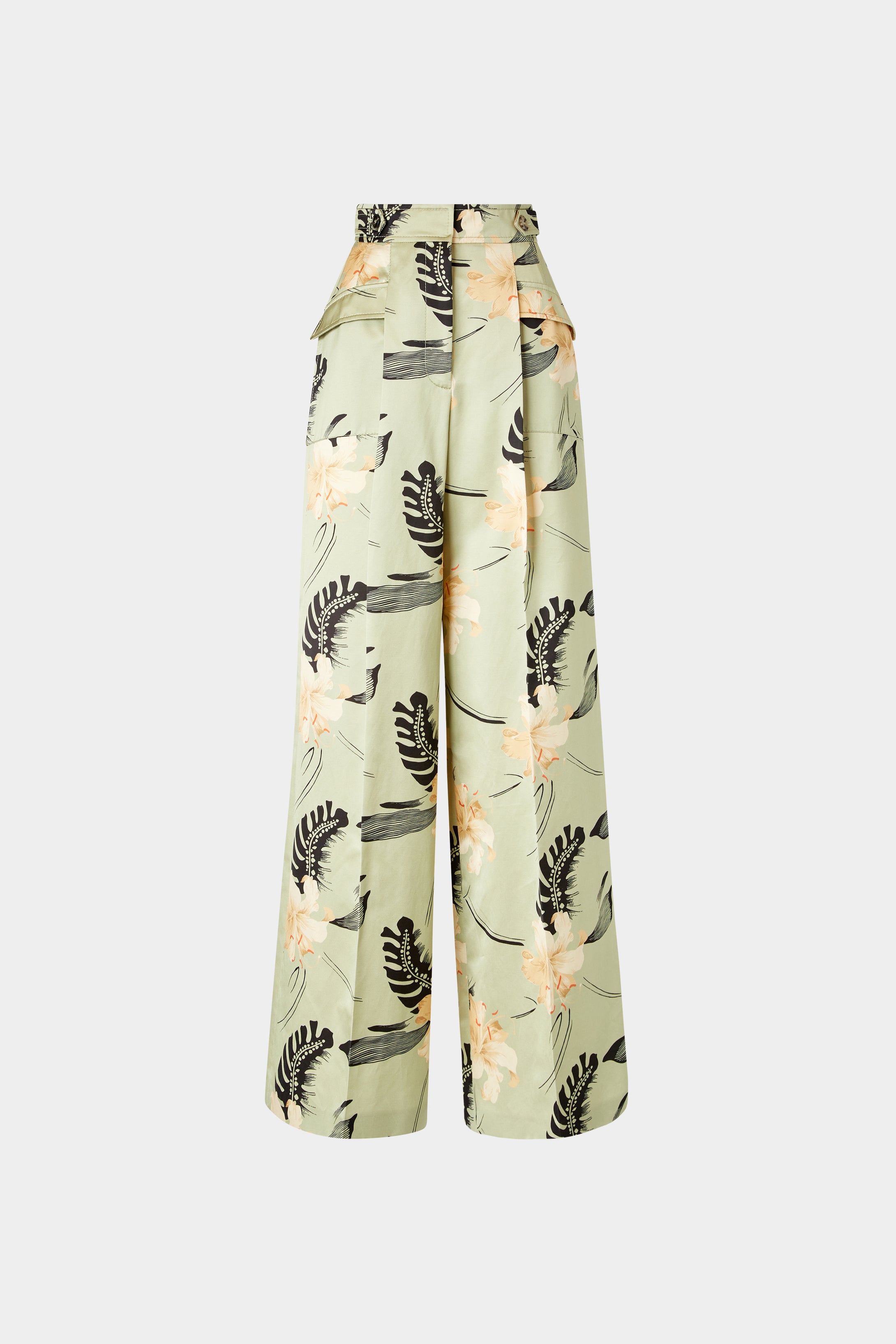 • Pantaloni palazzo a gamba larga con tasche laterali e stampa ibiscus.
