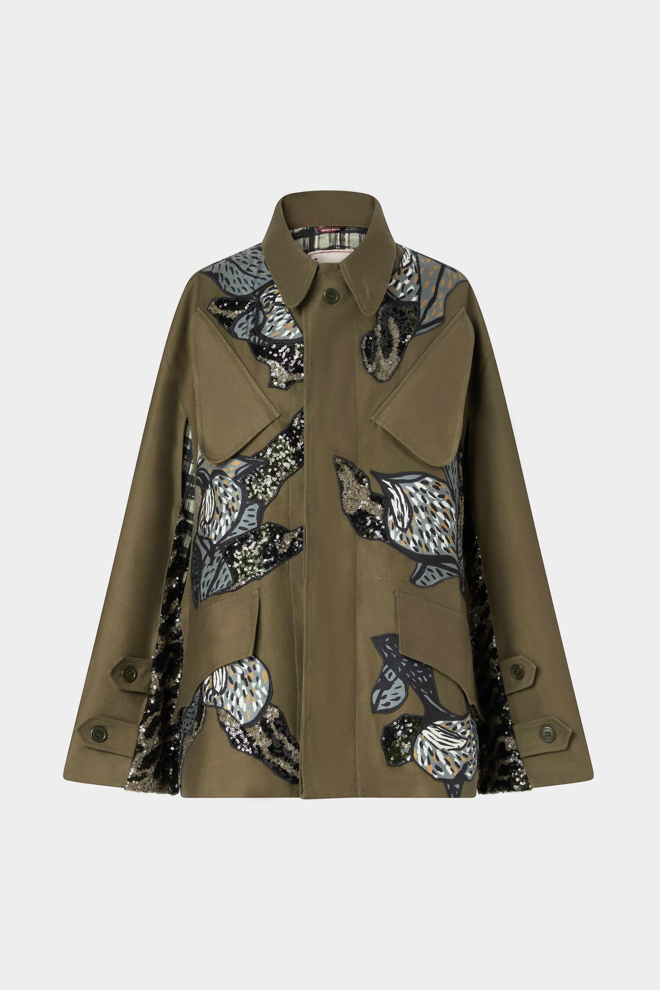 Parka verde militare in stile mantella con applicazioni floreali astratte e ricami con paillettes. Caratterizzato da ampi fori per le braccia, tasche frontali e una silhouette strutturata.