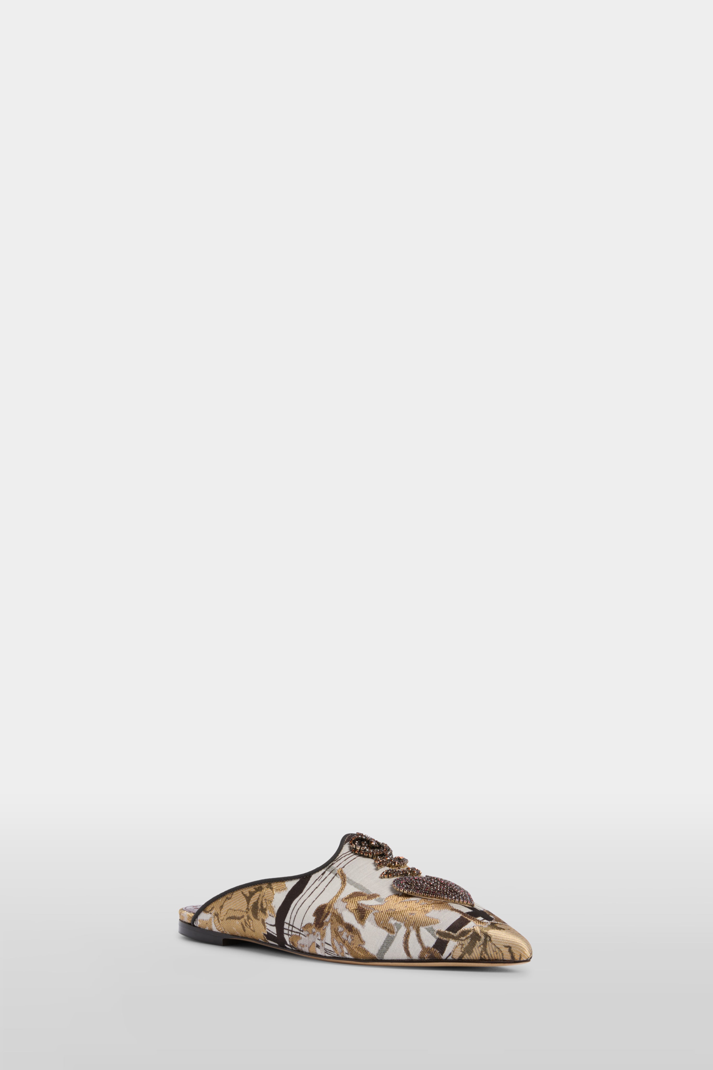 Mule appuntite in tessuto jacquard con motivo floreale, impreziosite da un cuore e una rosa con perline applicate a mano. Rifinite con piping a contrasto e una silhouette bassa ed elegante. Un pezzo raffinato che eleva qualsiasi look.