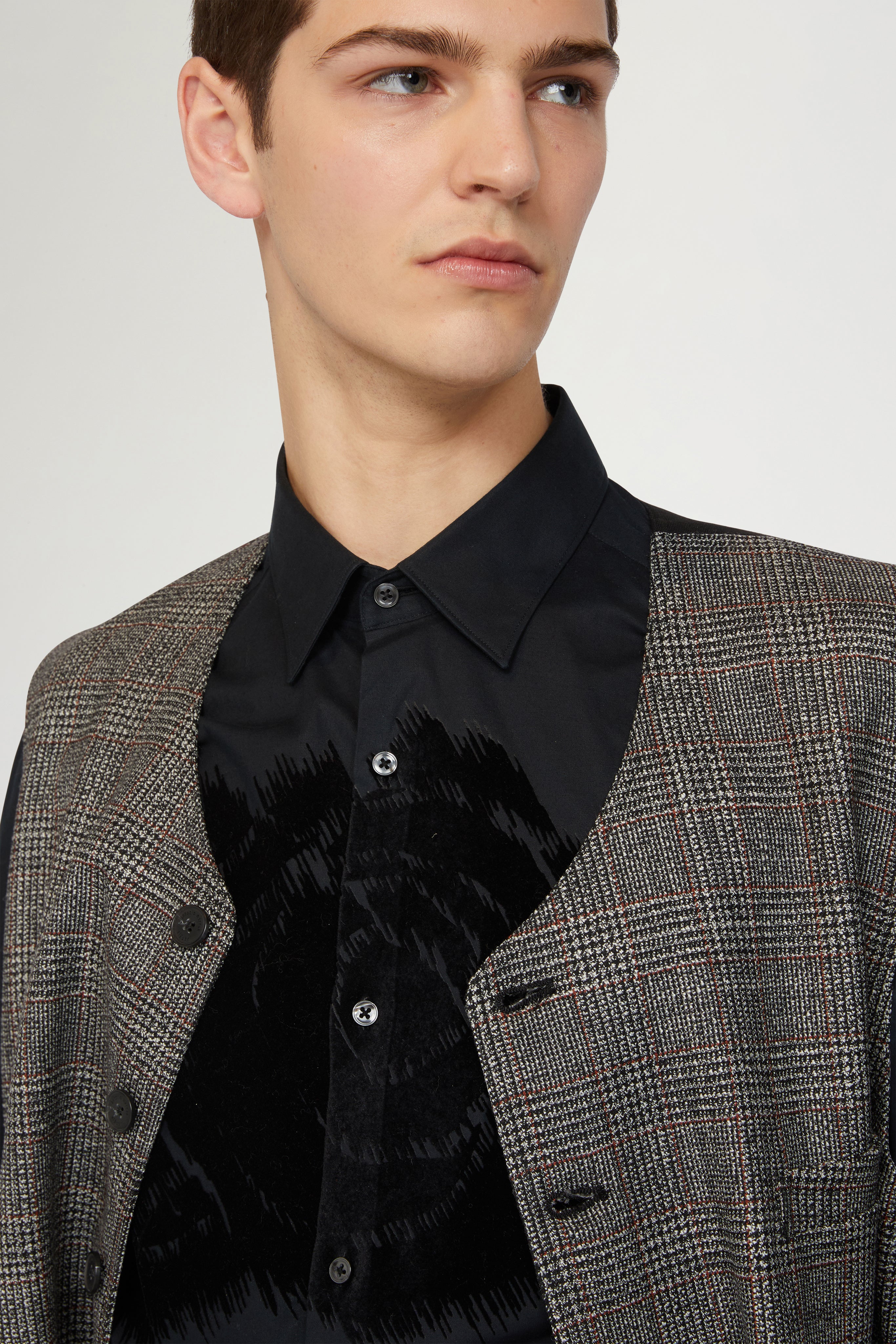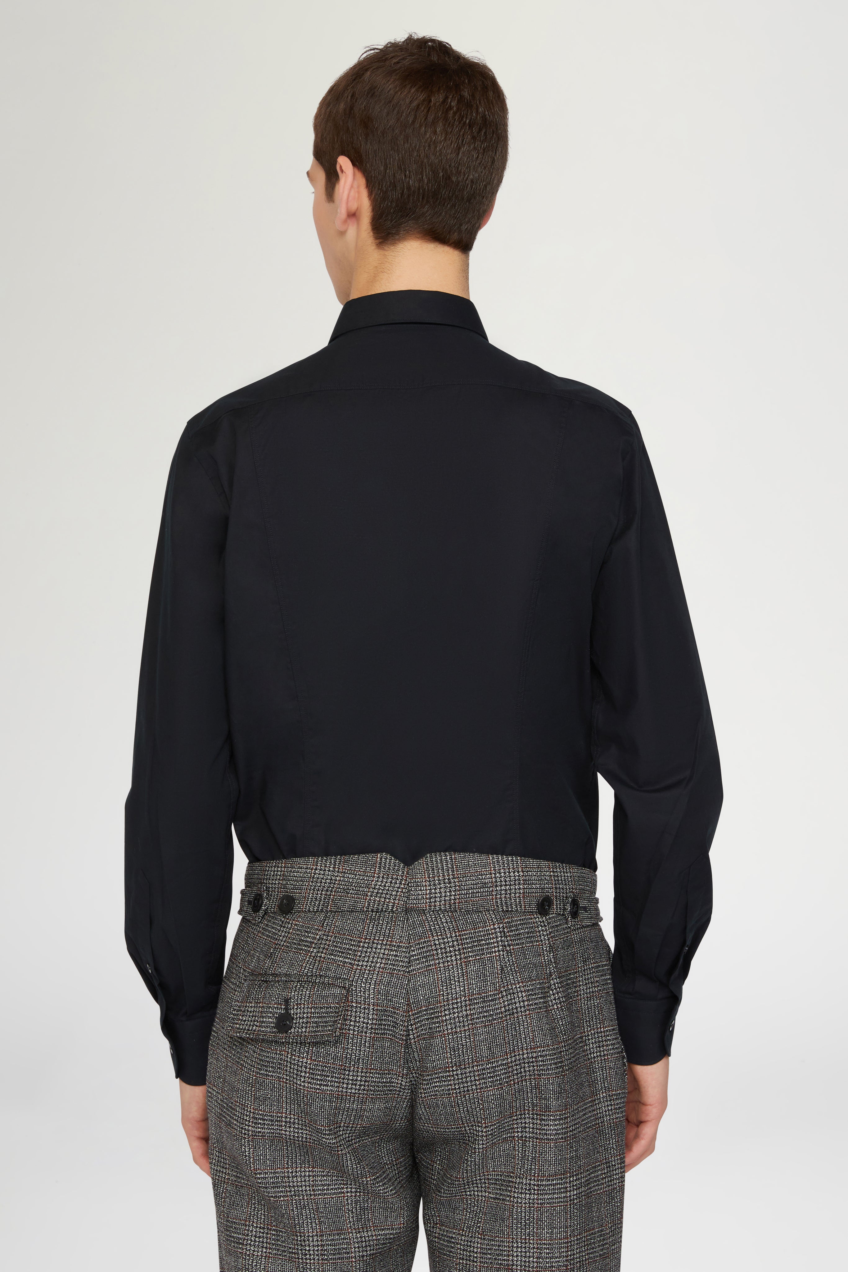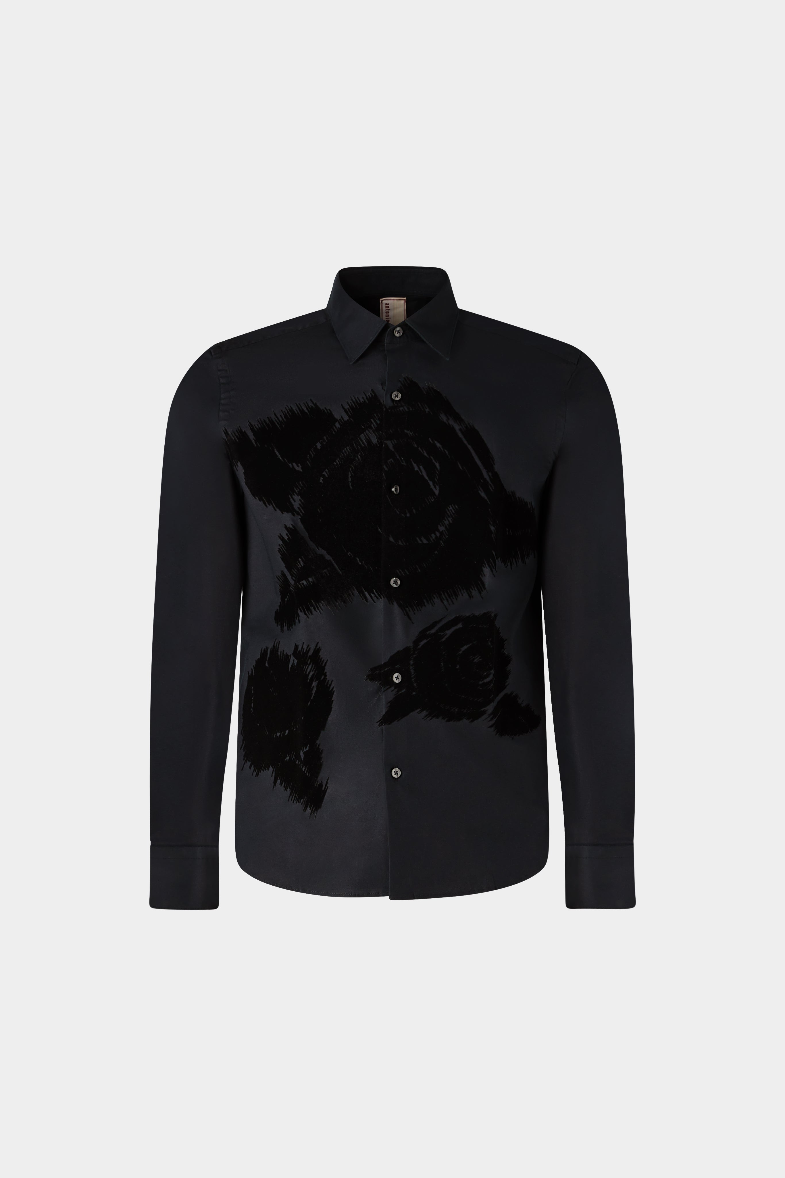 Tailored in fine cotton poplin, this black shirt features an artistic velvet rose motif that adds texture and depth. A refined reinterpretation of classic elegance, blending craftsmanship with a poetic edge.