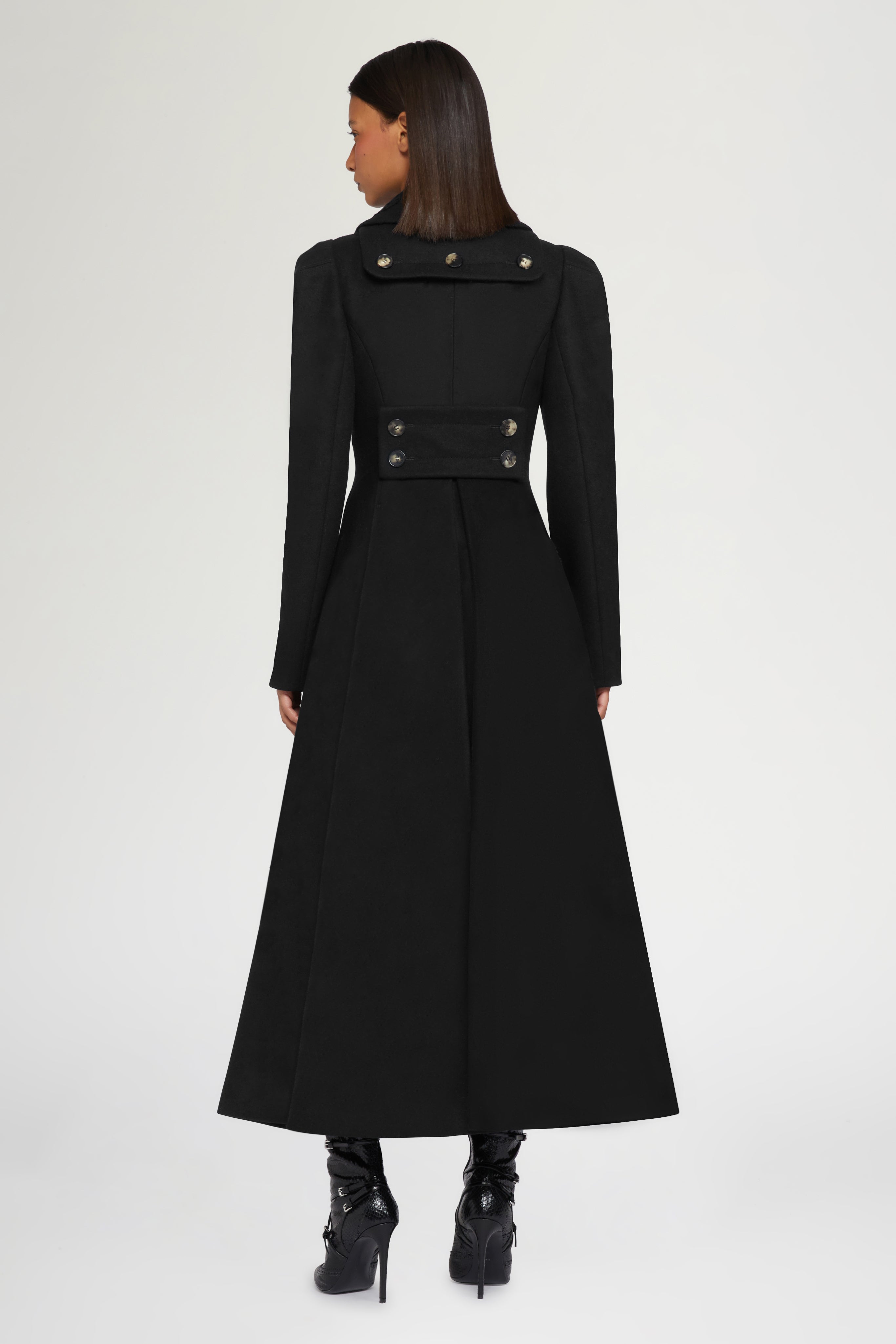 Tailored wool coat with a double-breasted front, structured shoulders, and a flared silhouette. Finished with buttoned details on the front and back for a timeless, feminine look.