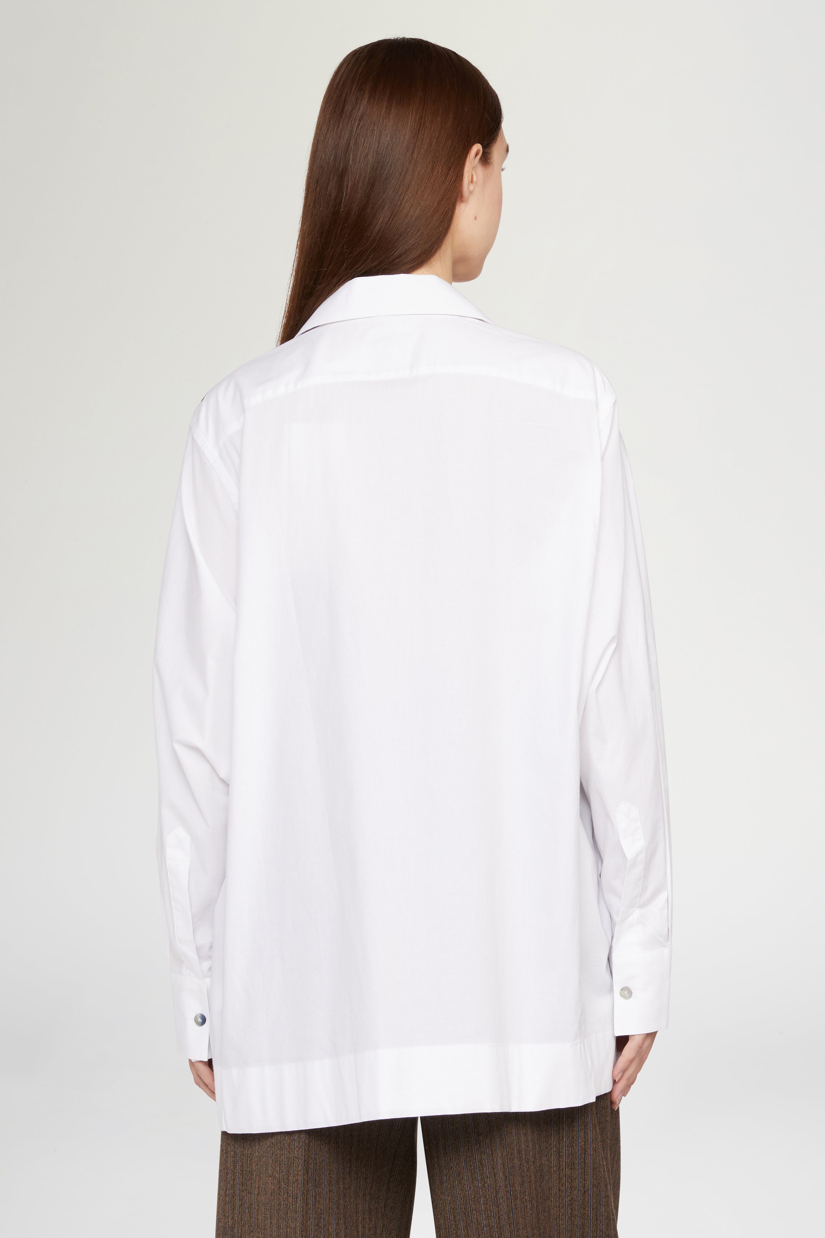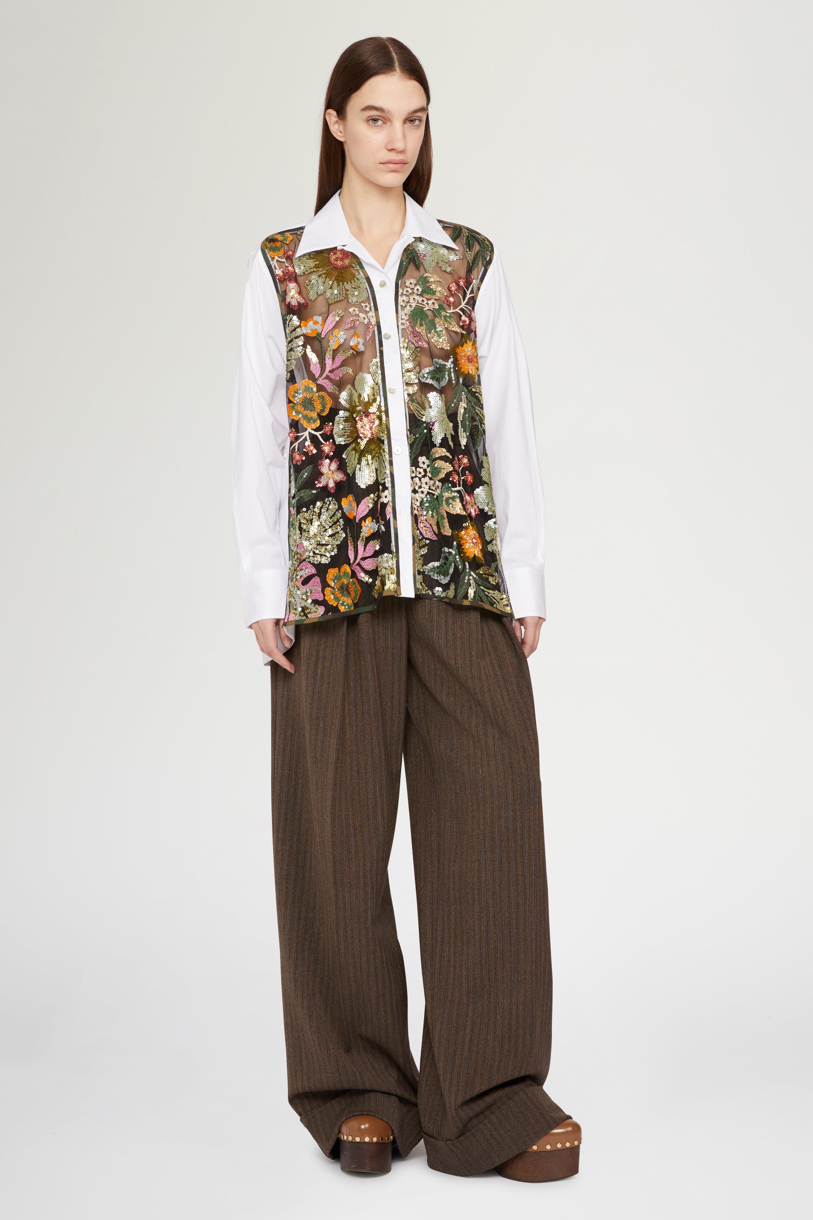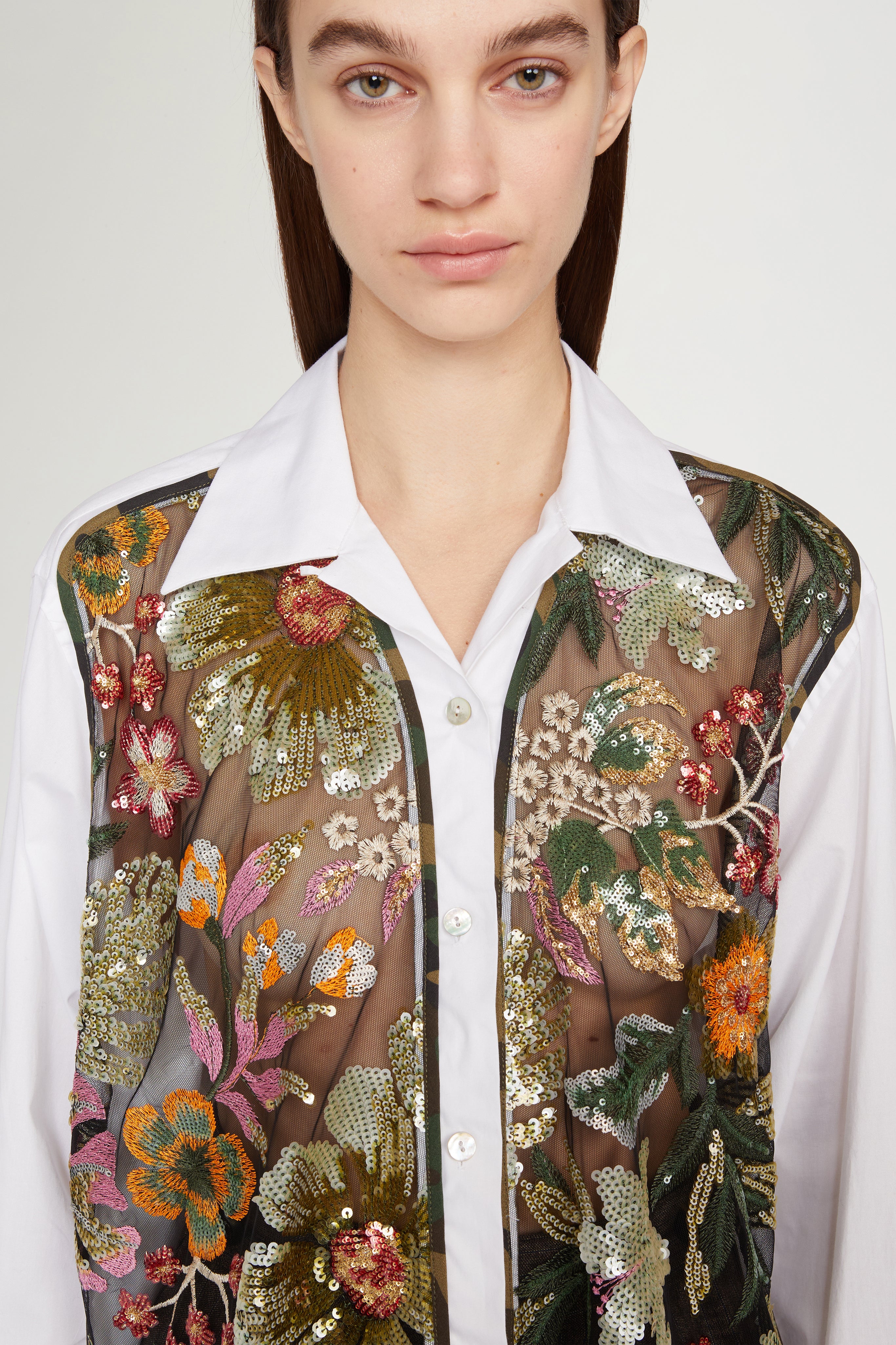 Elegant white embroidered shirt crafted in cotton, featuring a sheer front panel embellished with vibrant floral sequins.