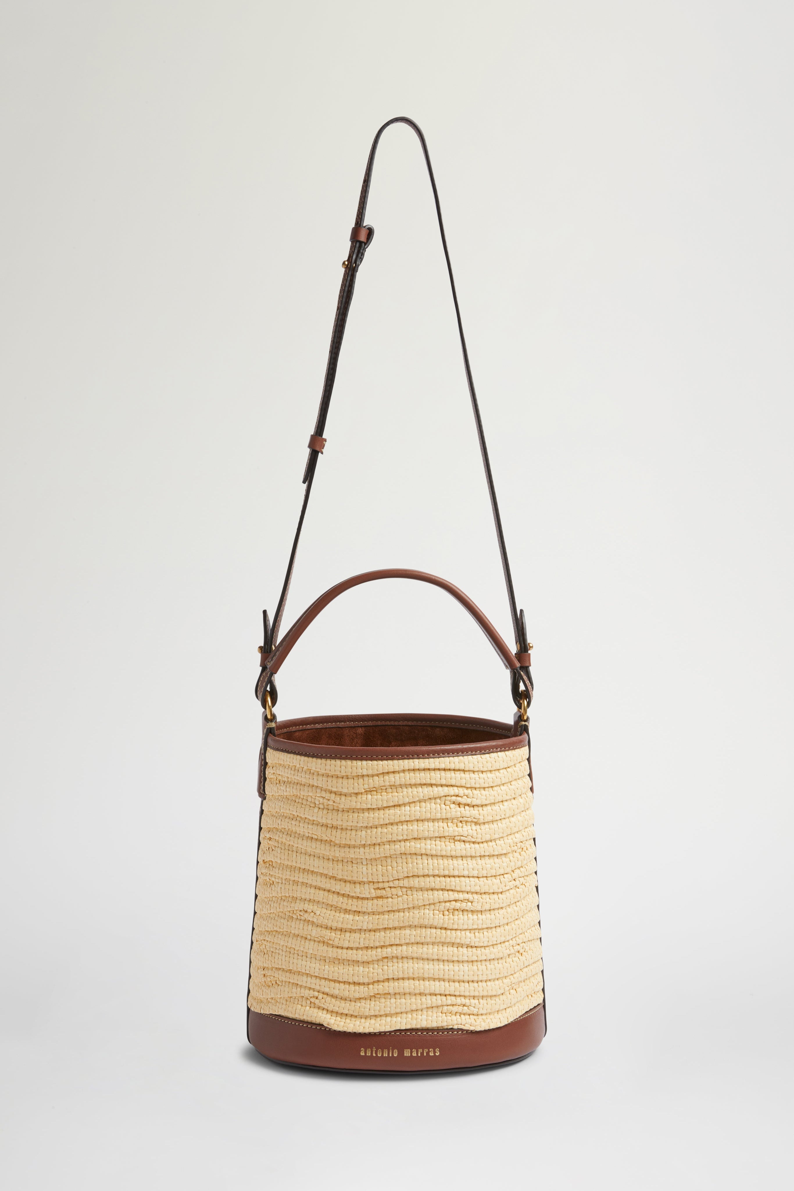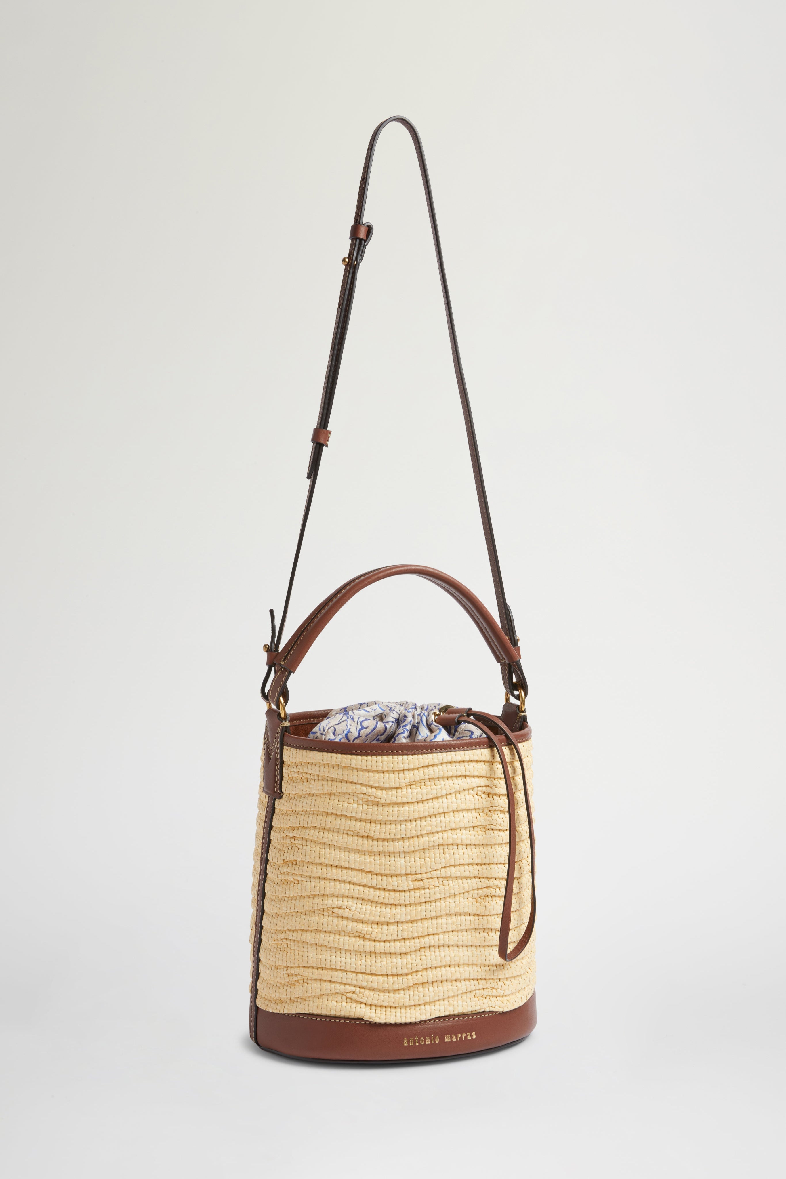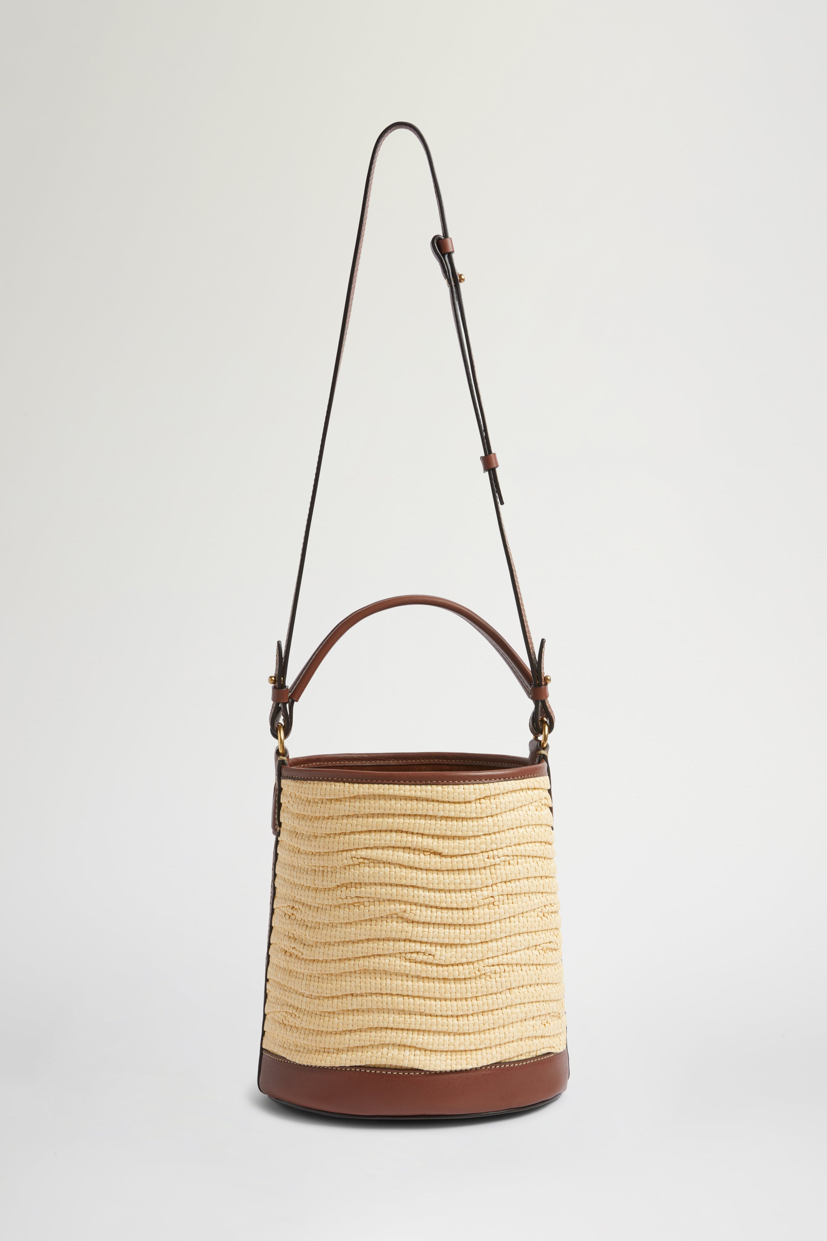 • Bucket bag in woven raffia with leather trims, adjustable shoulder strap and cotton lining.