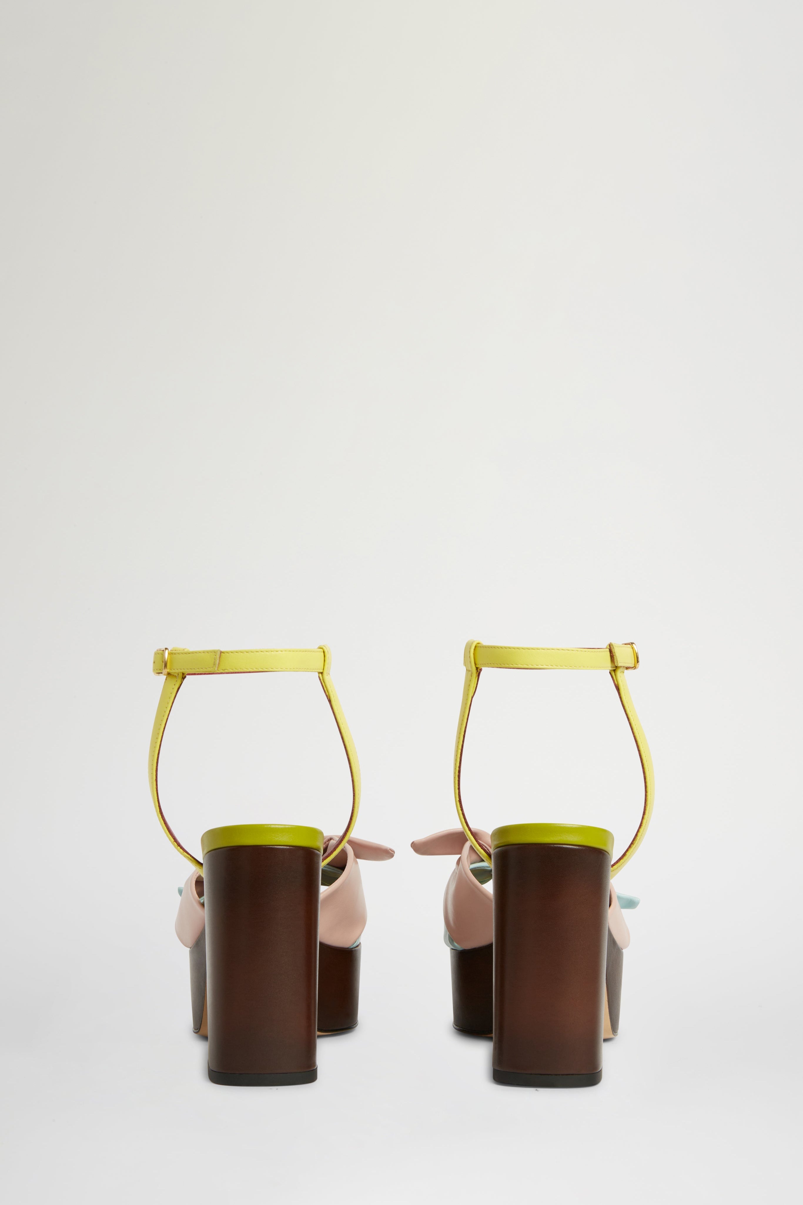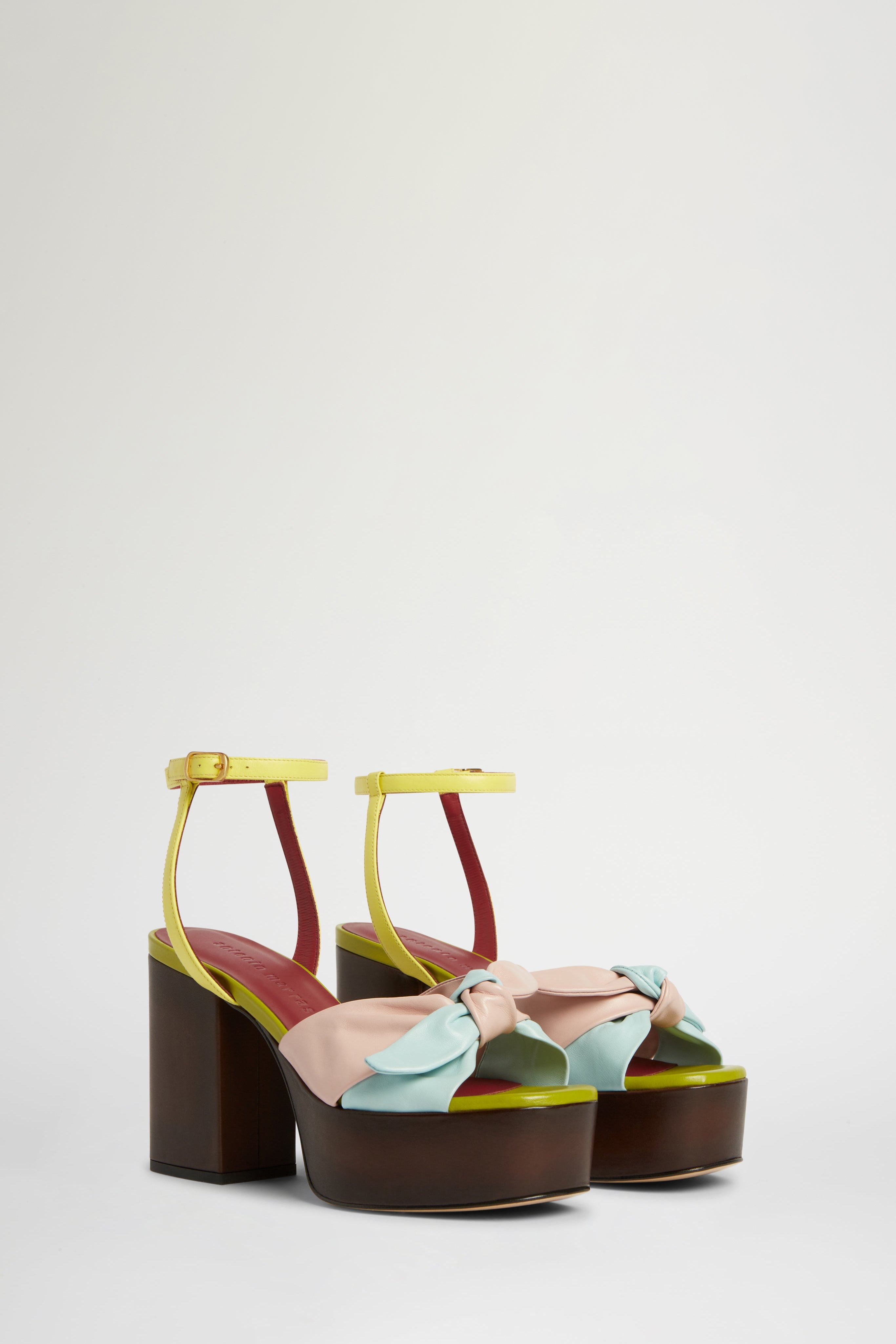 Stylish and comfortable sandals in multicolored leather, with bow-tied strap and supportive platform sole.