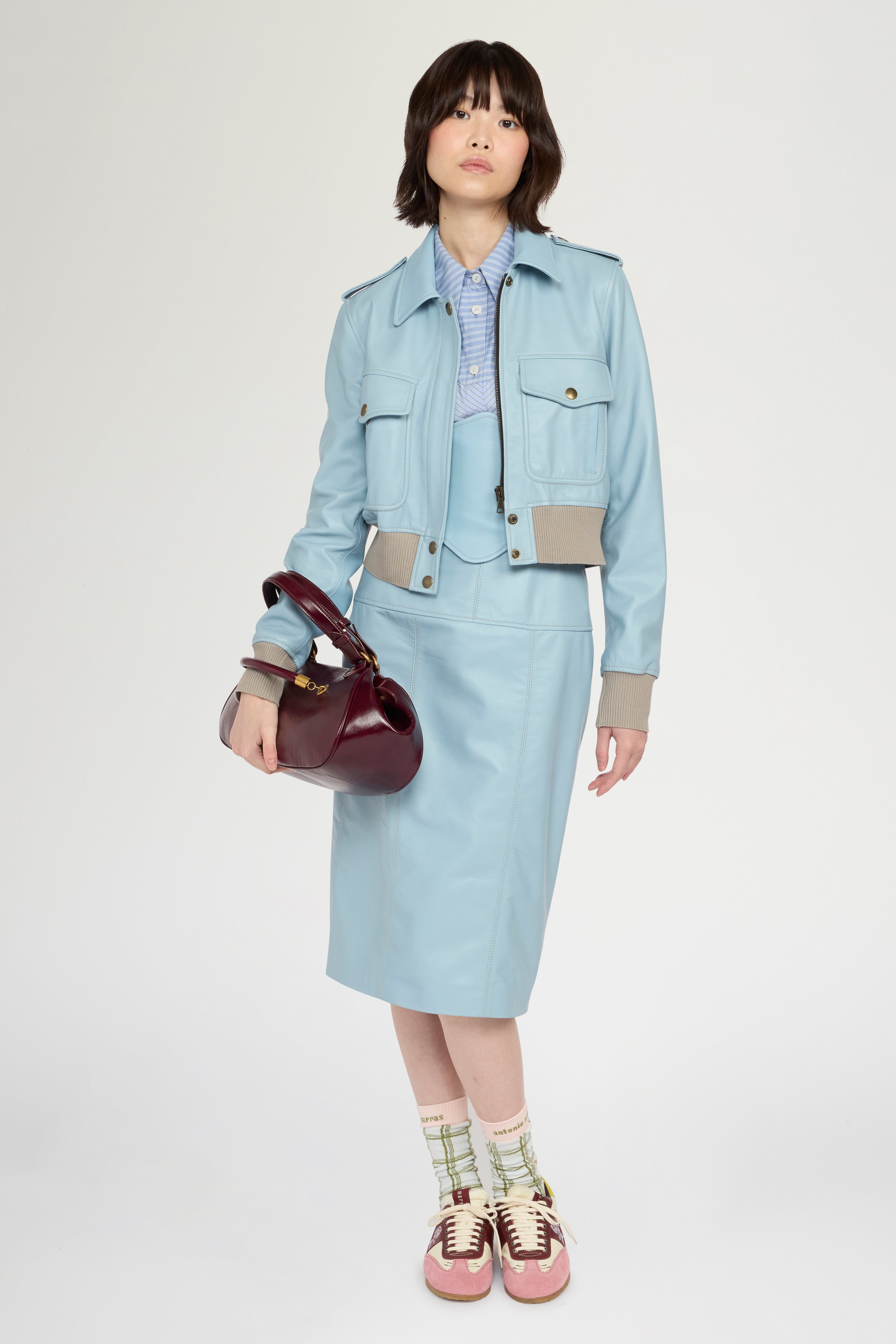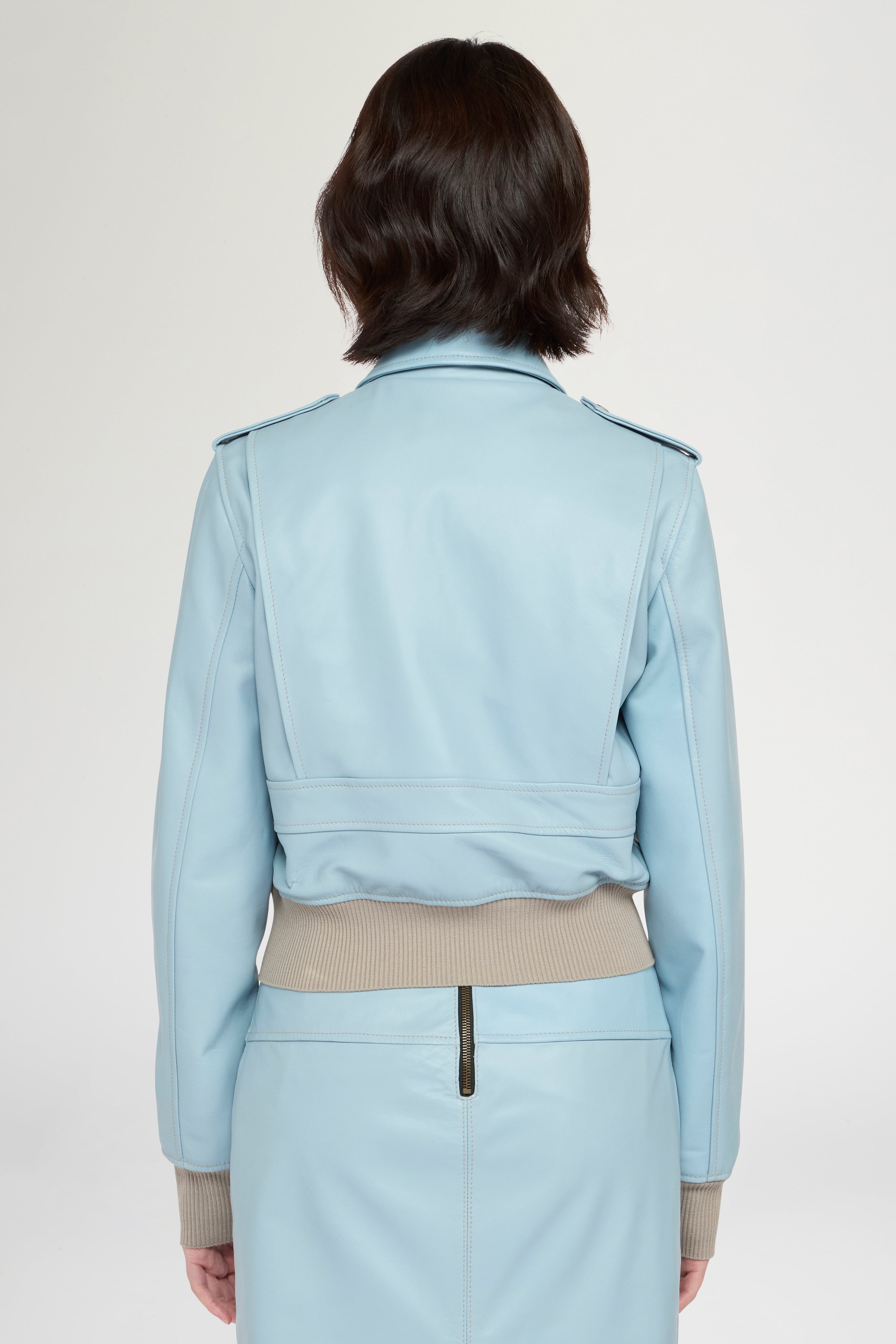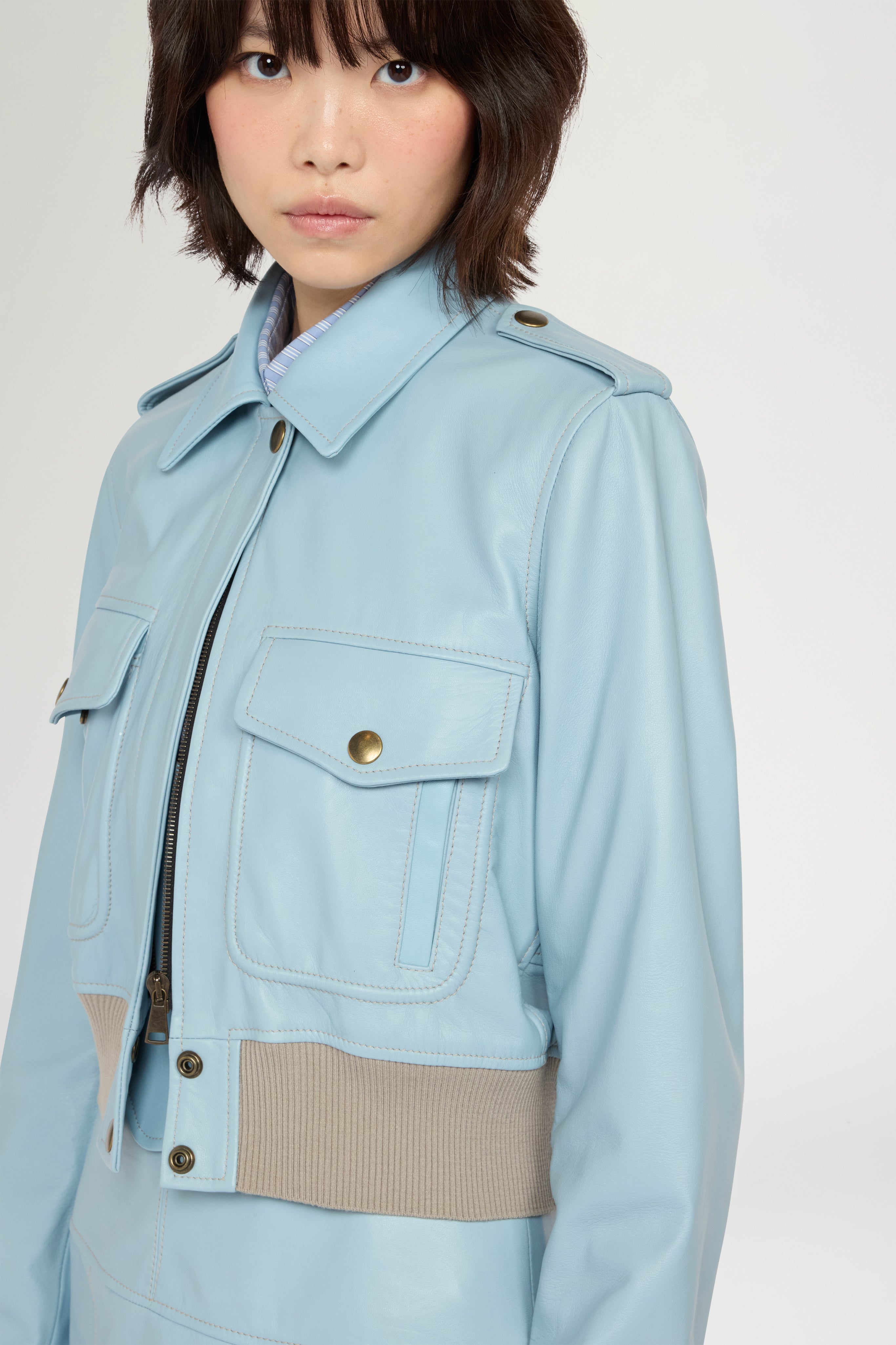 Light blue leather bomber jacket, crafted with a subtle aged finish. Inspired by the classic aviator bomber, reinterpreted in a more feminine, cropped proportion. Constructed with tone-on-tone ribbed knit trim, fitted at the hem at waist level and at the cuffs. Patch pockets applied on the chest. Made in Italy.