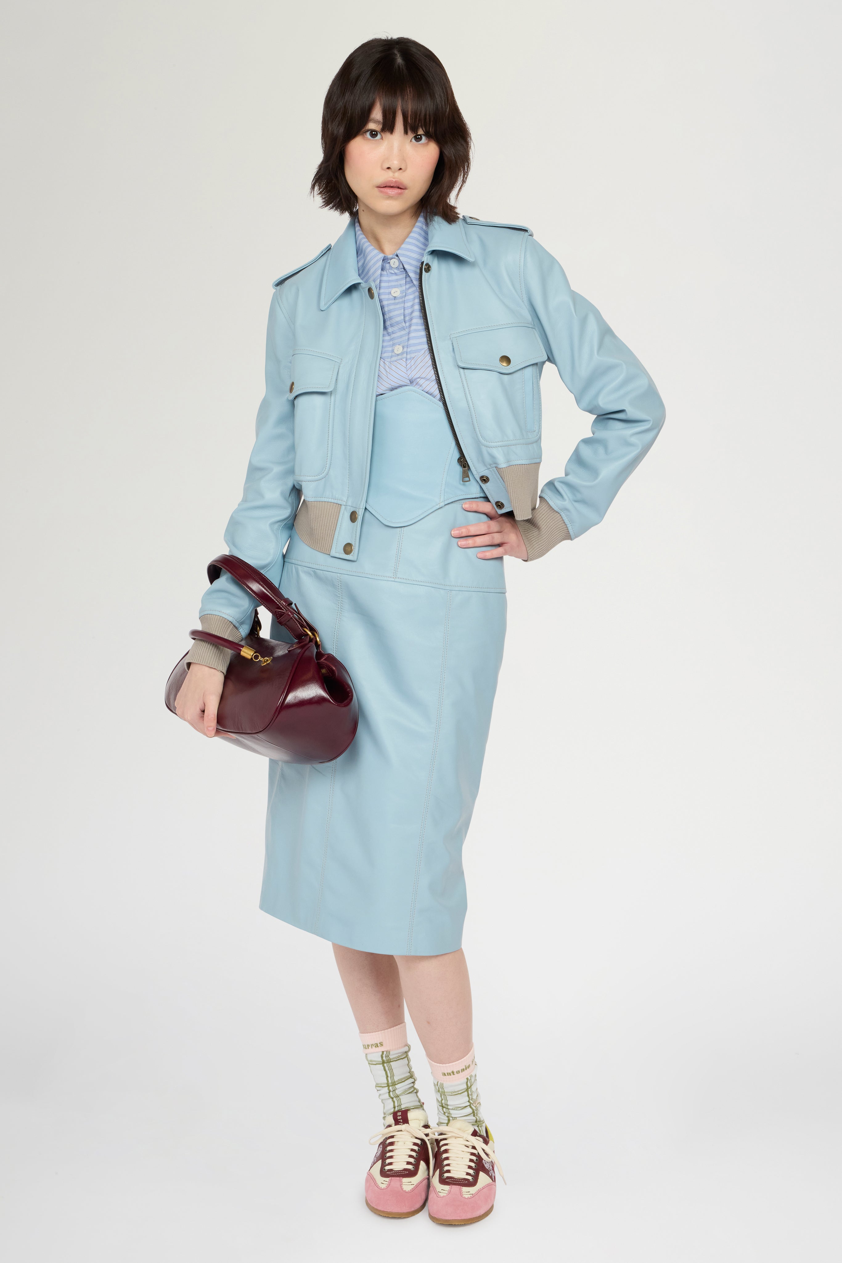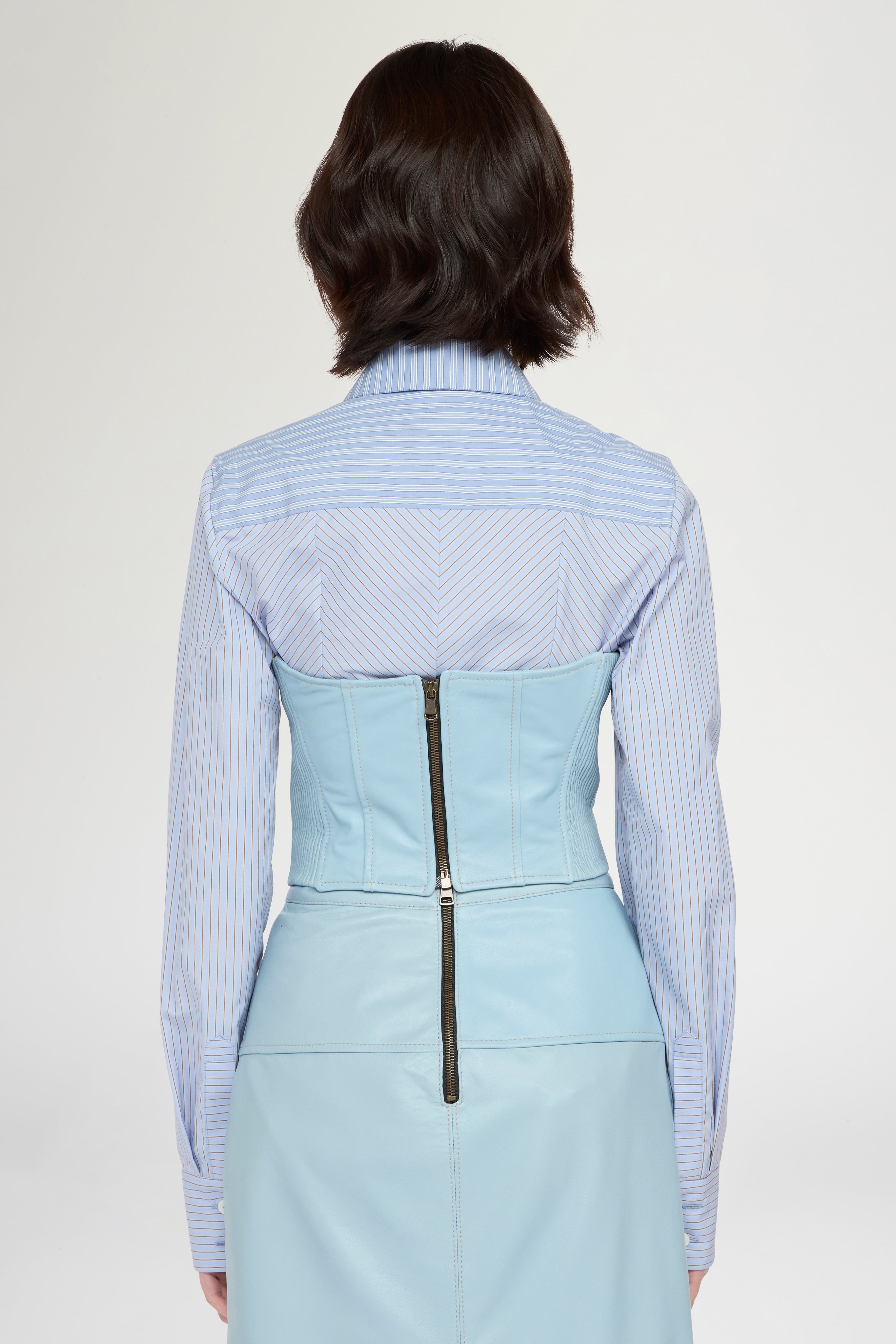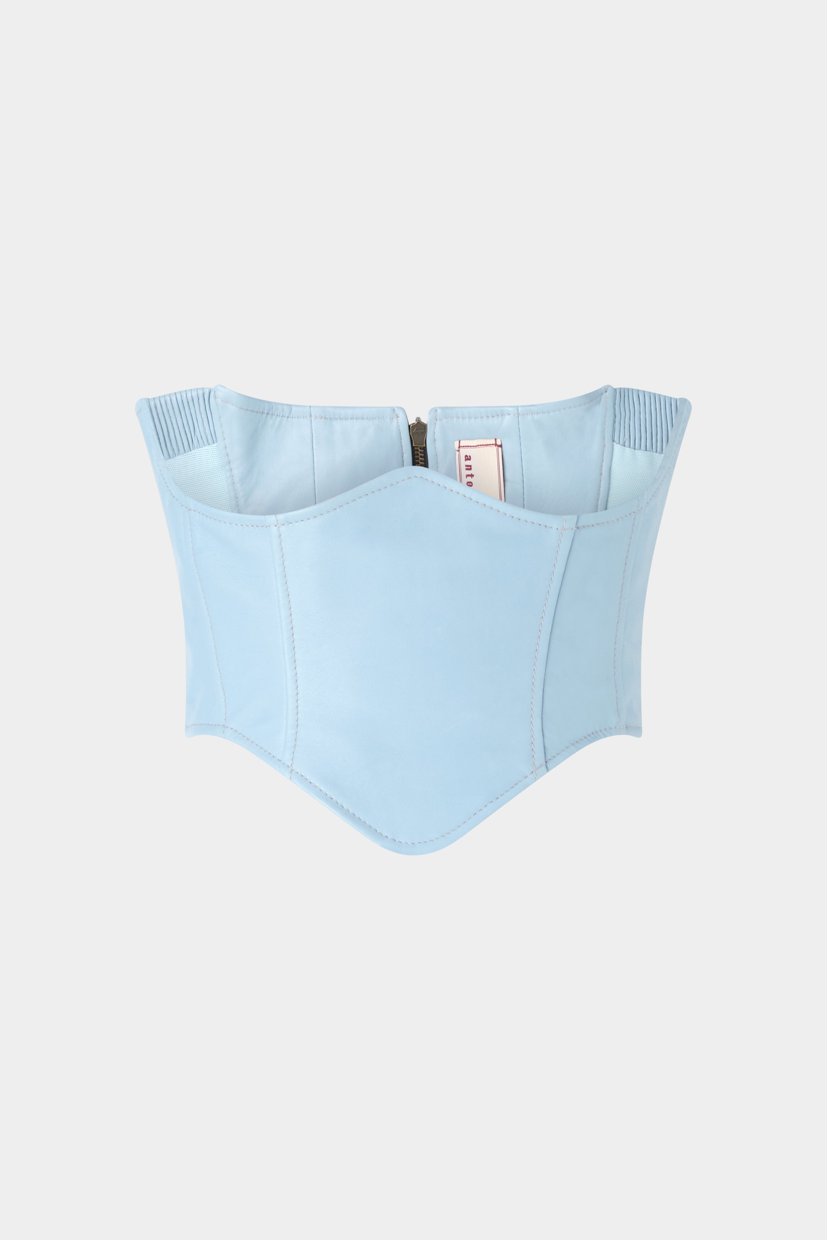 Bustier crafted from 100% soft, lightweight leather, featuring a deep curved neckline and a softly rounded point at the center front hem — a detail that defines the bodice construction and enhances its line. The back zip closure ensures a close fit and a clean structure. Slim fit.
