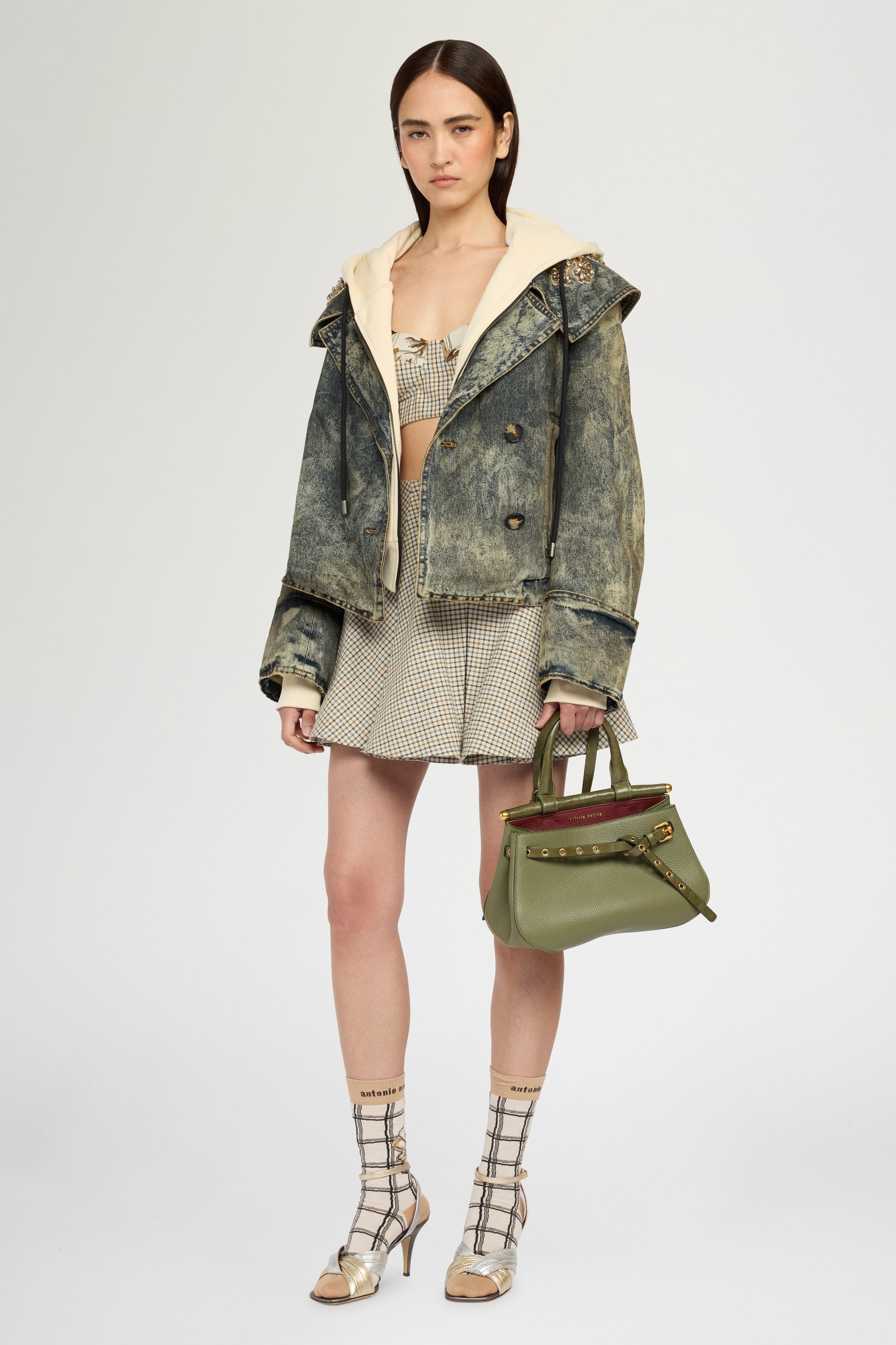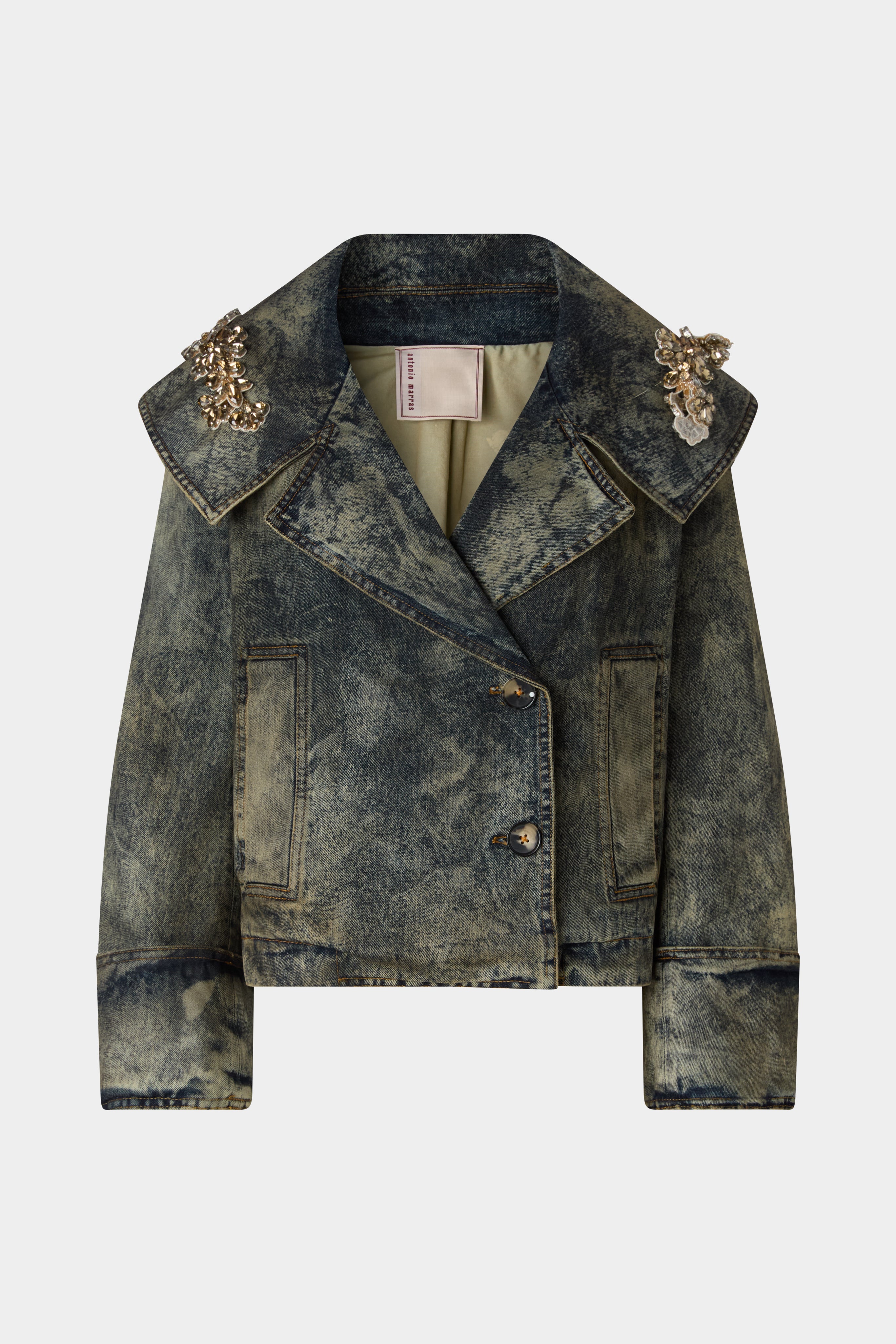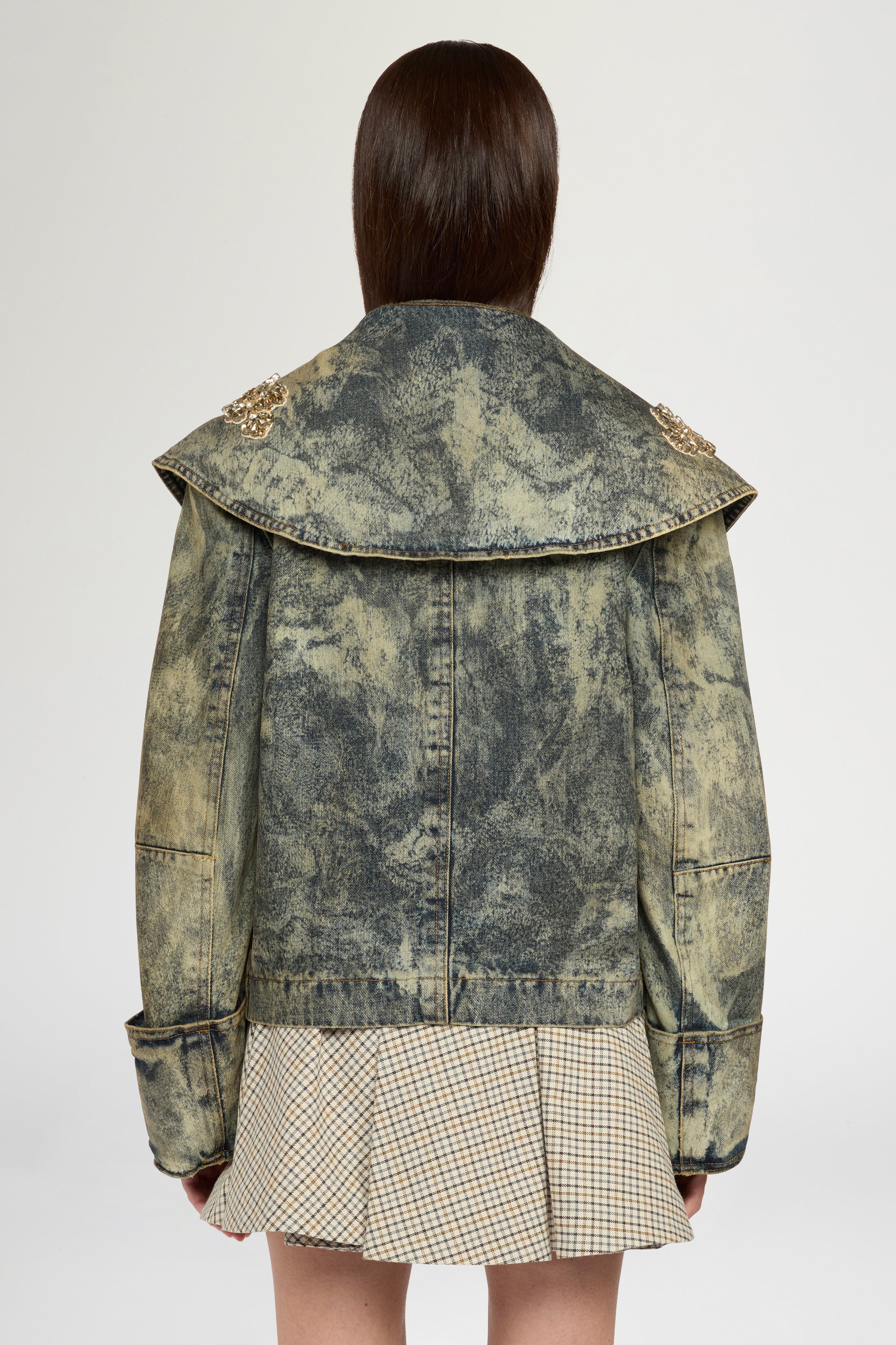 Features a wide lapel and maxi turn-up cuffs at the sleeve hem, with waist-height side pockets. Made from denim with an aged wash that blends classic denim tones with a sandblasted effect. Aged-effect stones with bronze highlights are applied on the sides of the maxi collar as subtle light accents. Boxy fit. Regular length. -
