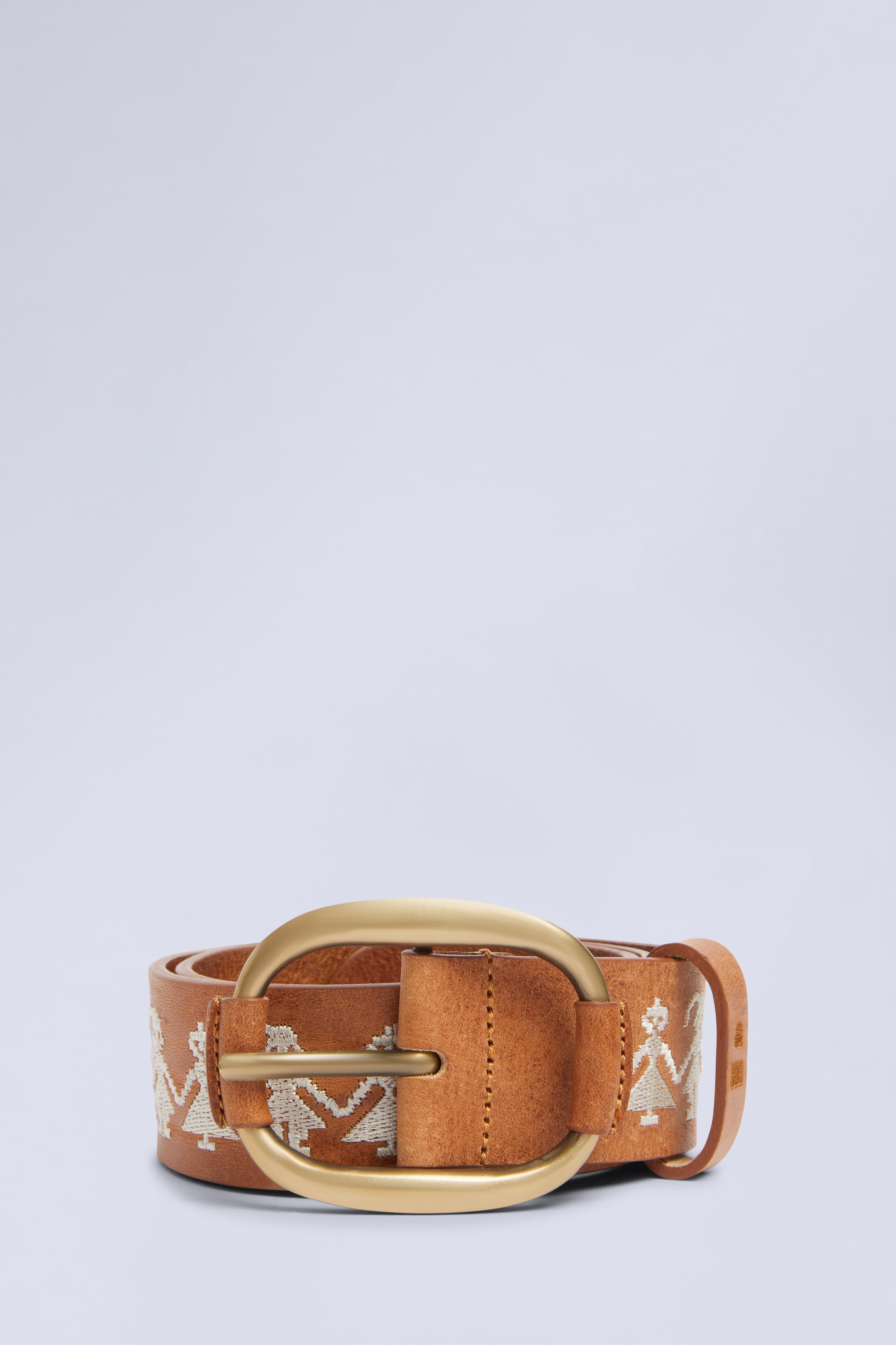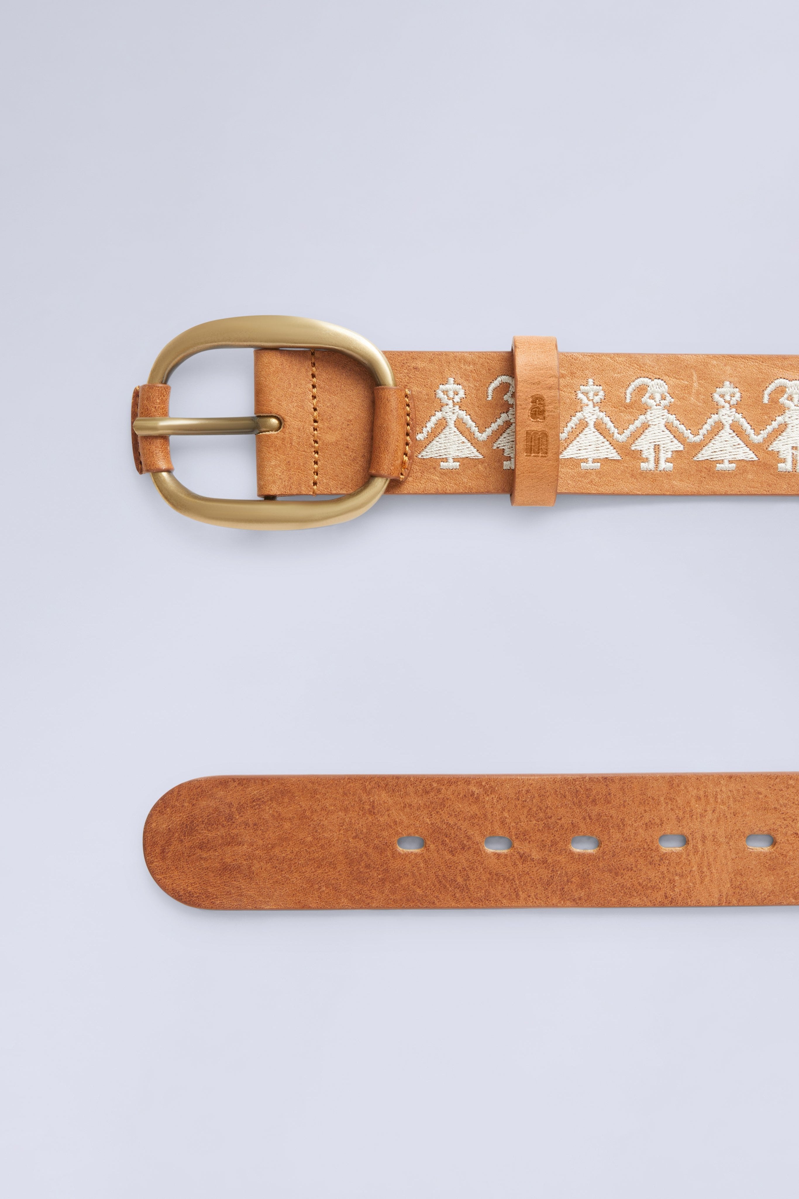Belt made from cognac vintage-effect bovine leather, decorated with thread embroidery of the traditional Sardinian ballet motif and an aged gold-finish buckle. Embossed logo along the belt loop.