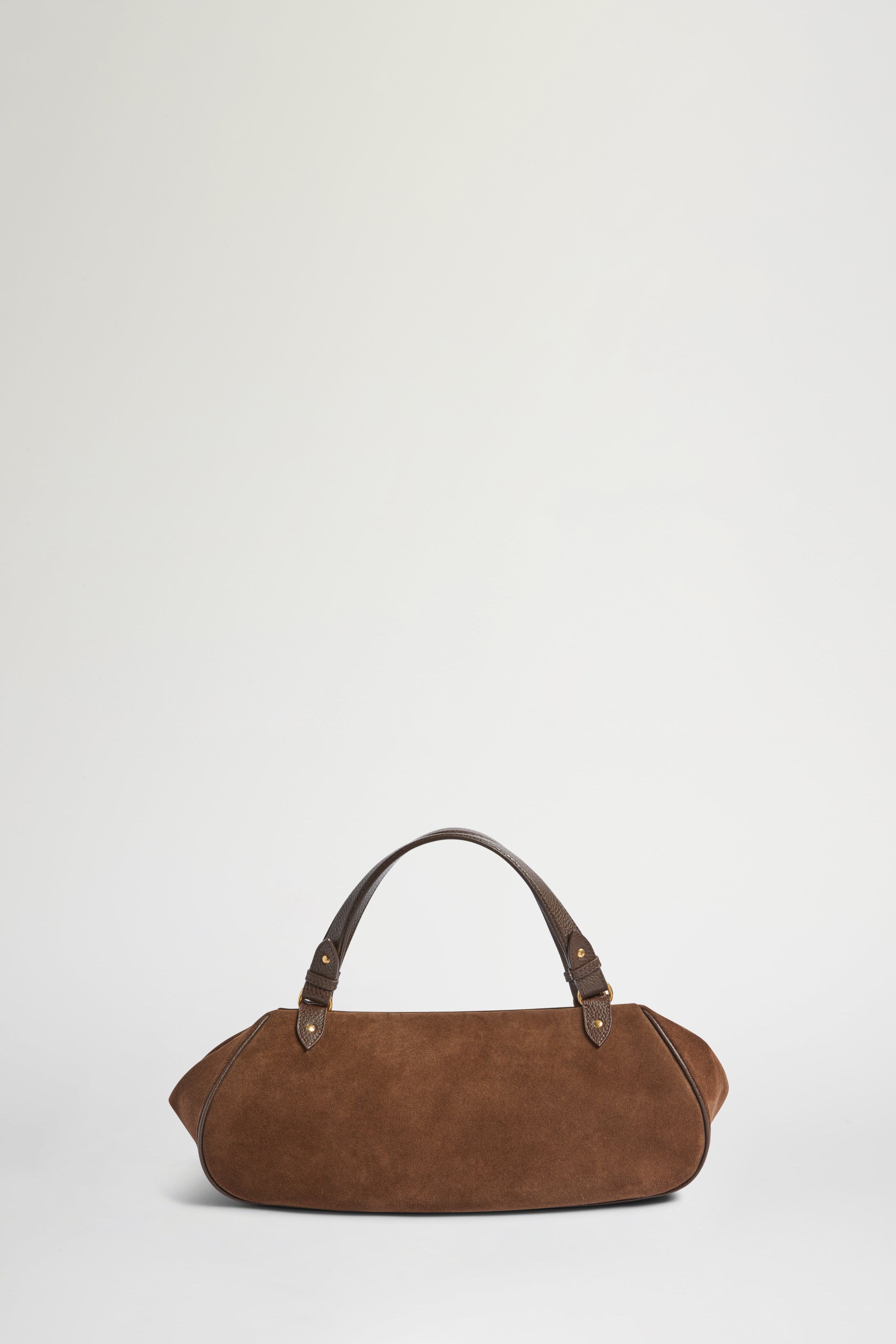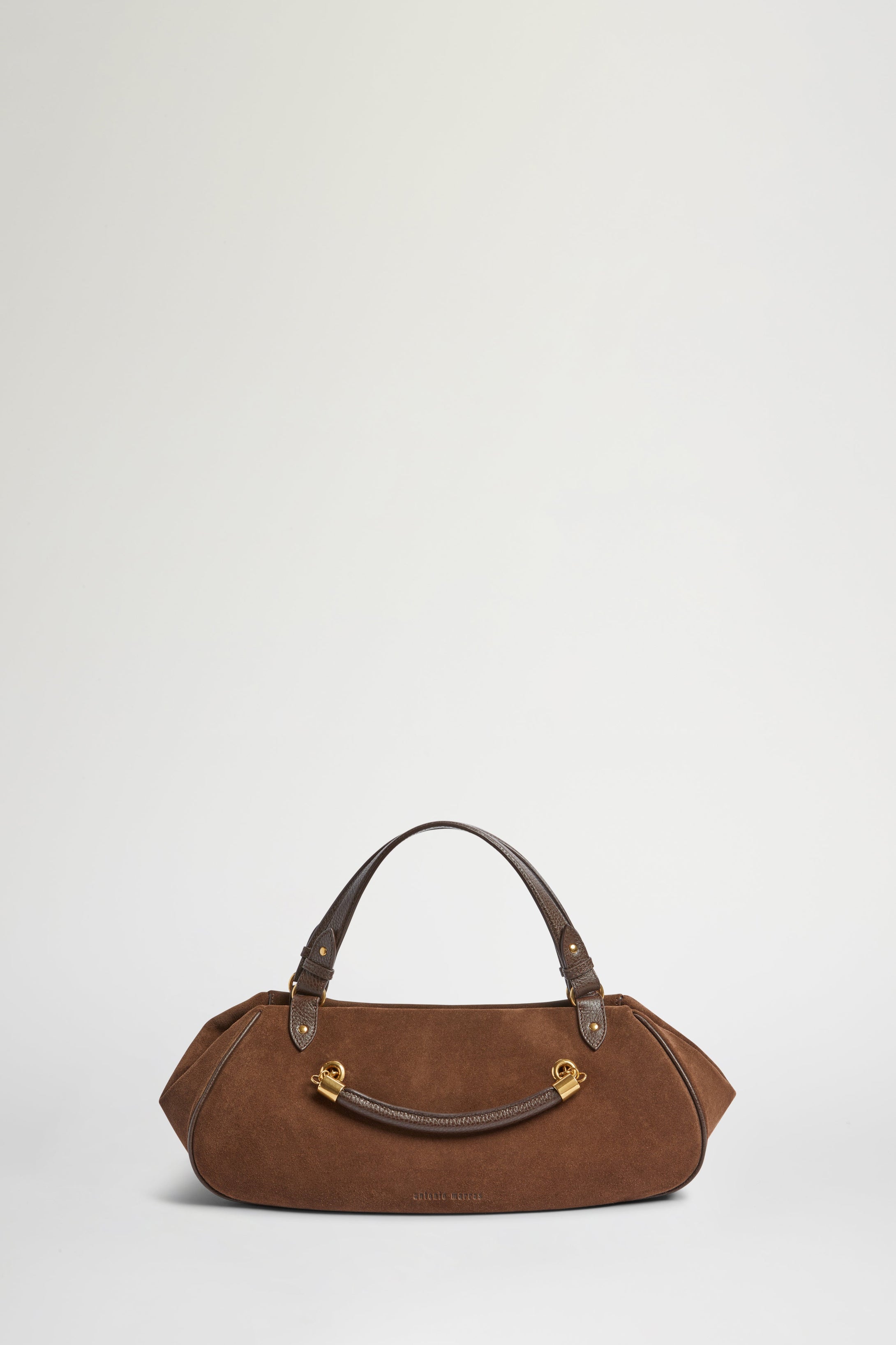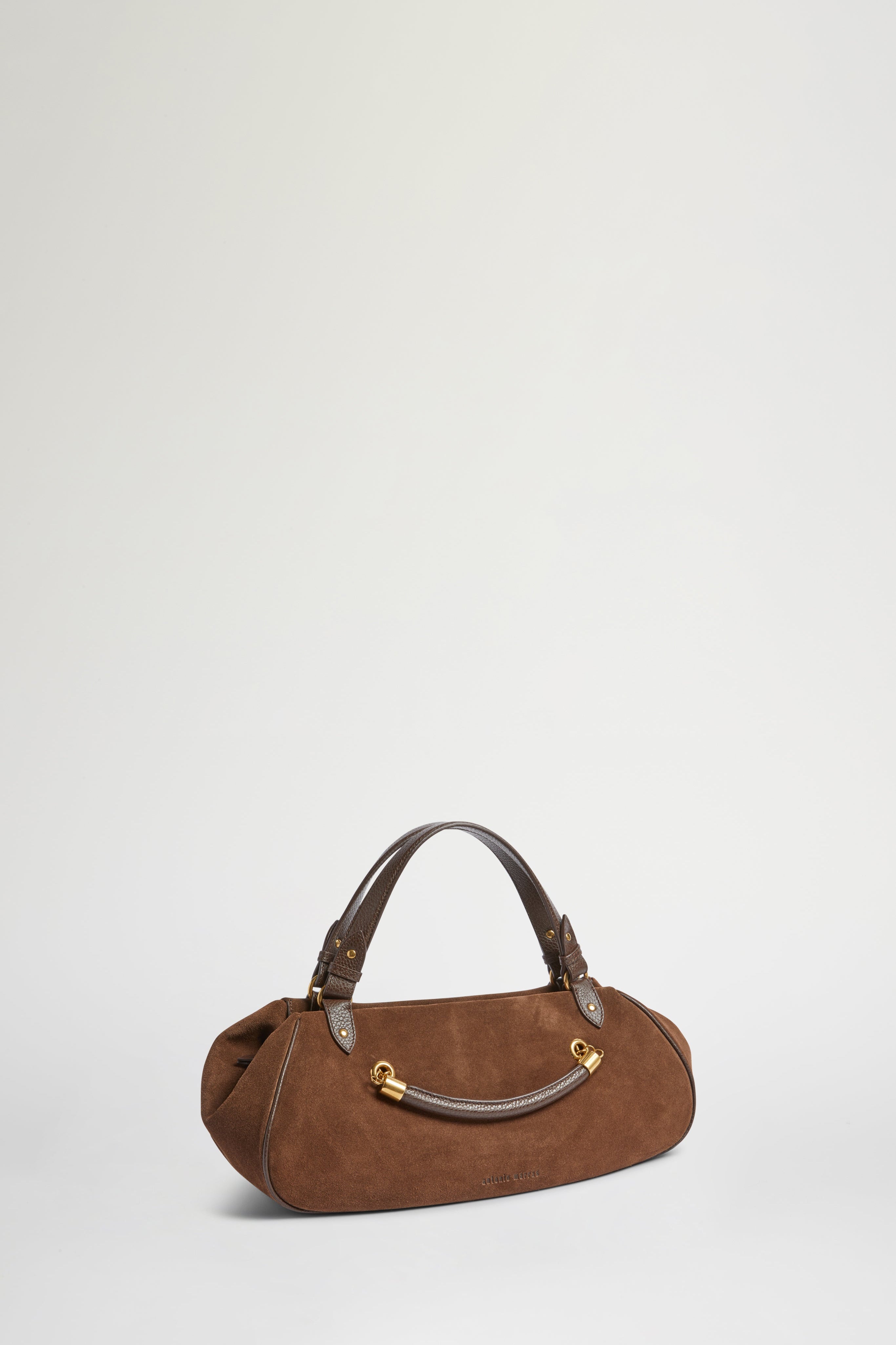 Elegant bowling bag in brown suede leather with gold hardware and curved silhouette.