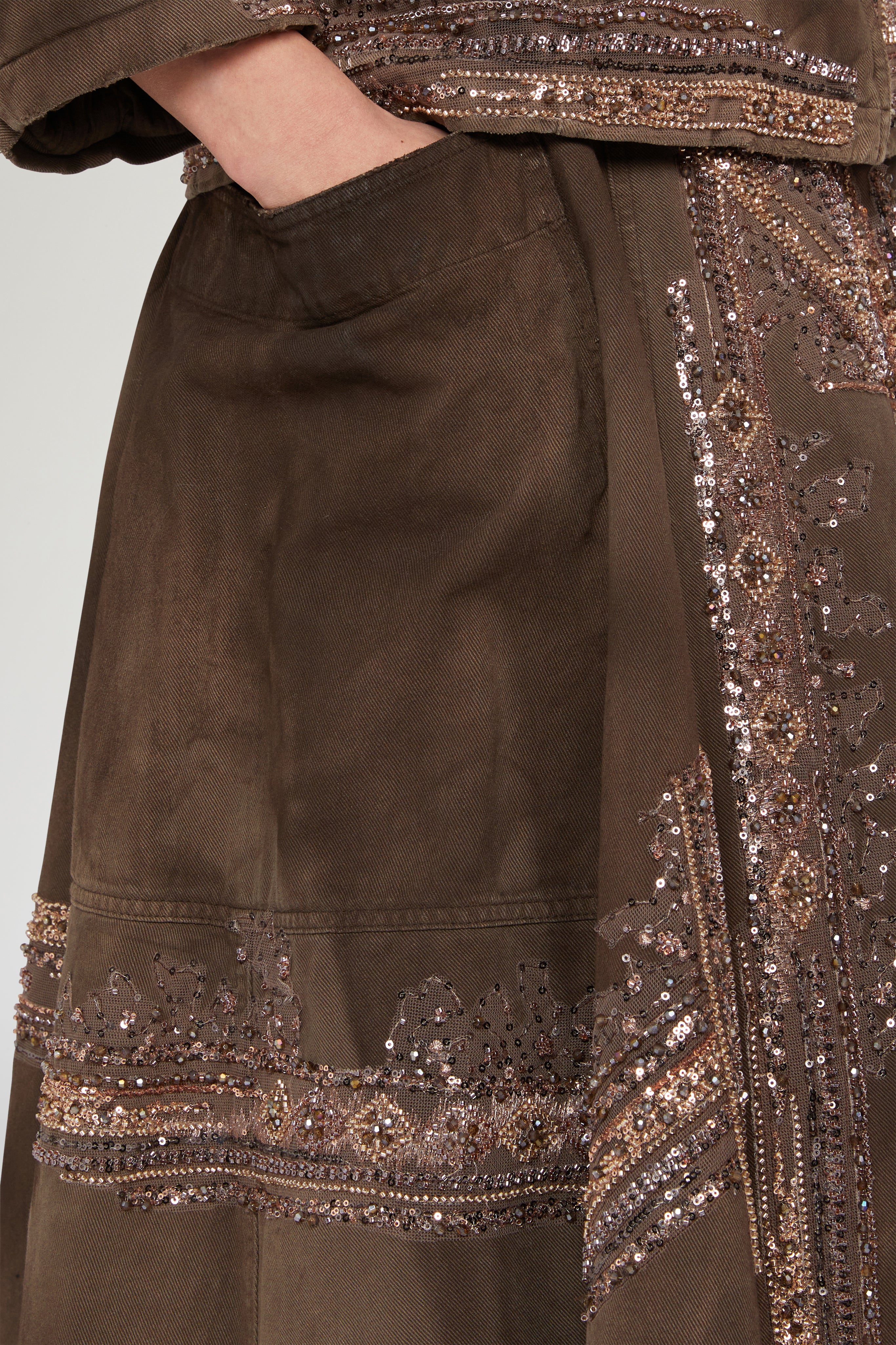 Midi skirt in brown denim with sequin embroideries and wide side pockets.