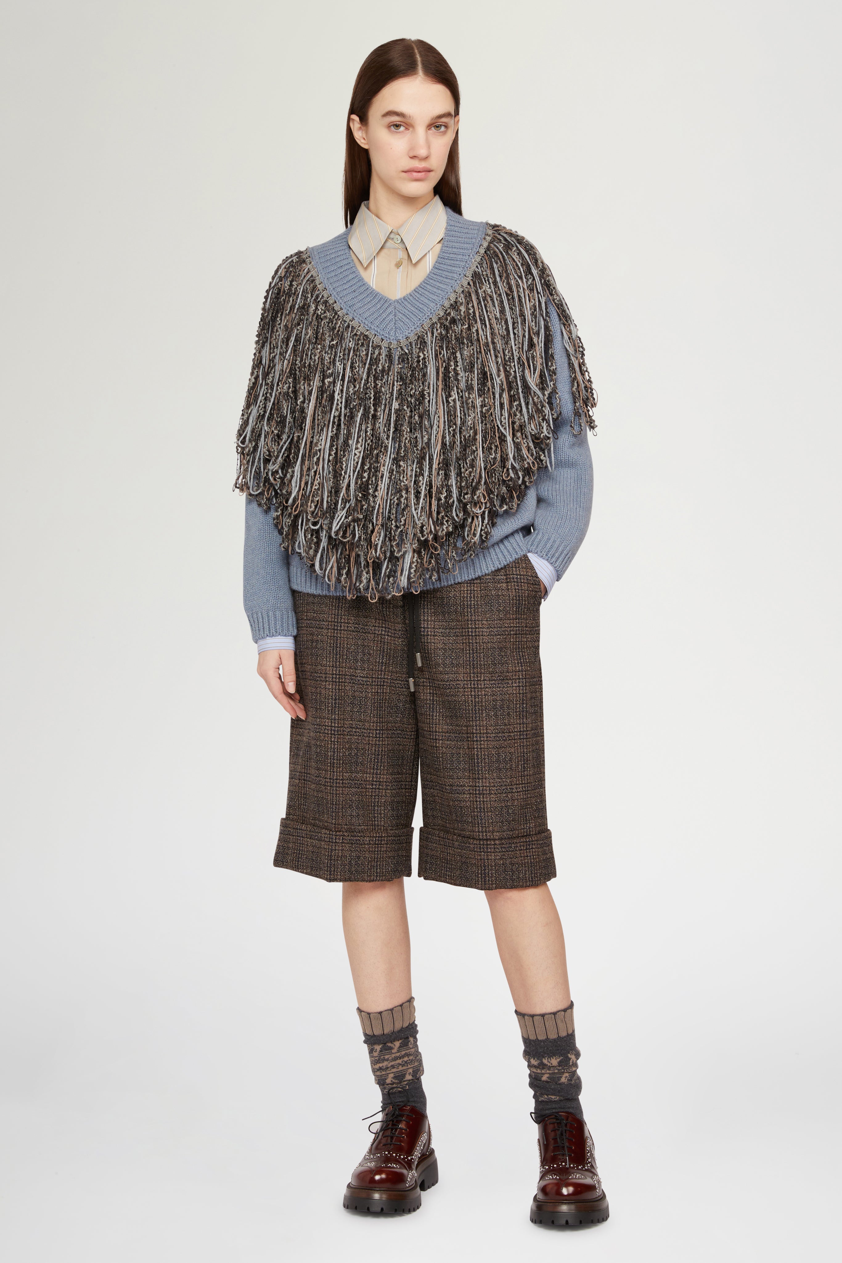 Soft cashmere sweater in a delicate blue hue, featuring a deep V neckline and dramatic grey fringes across the front and shoulders.
