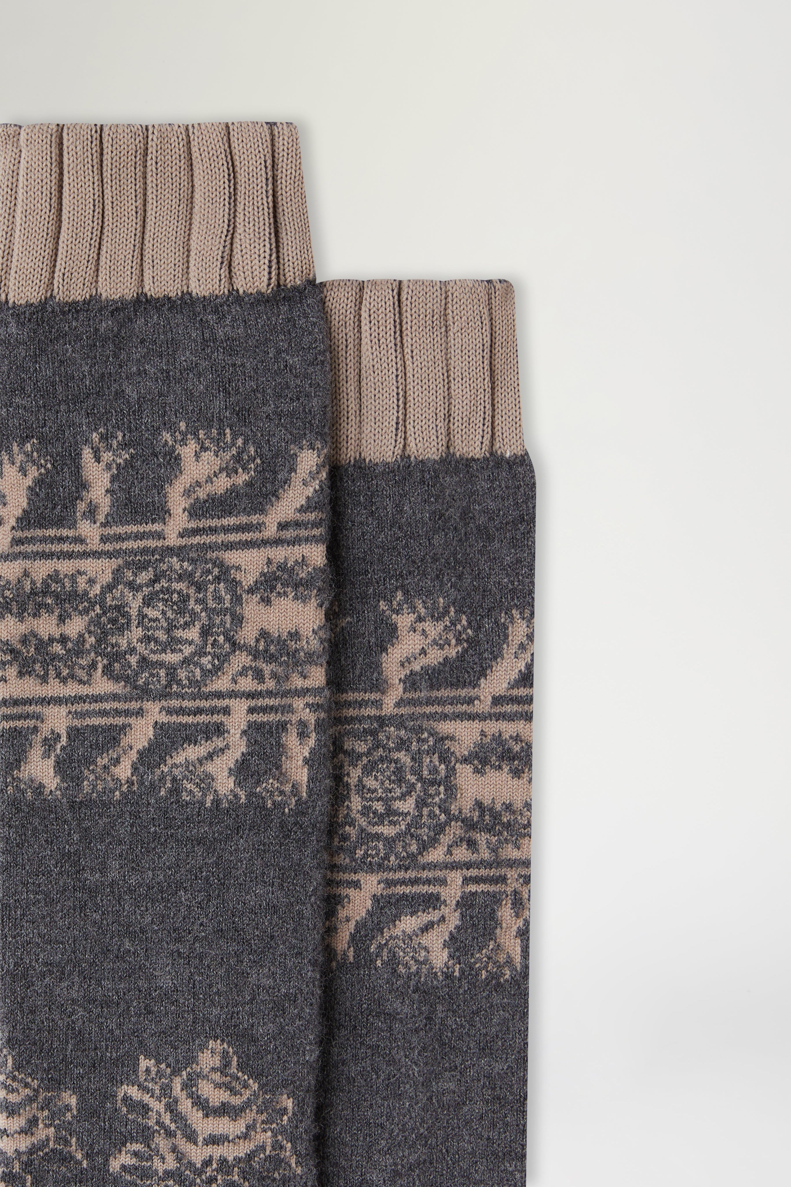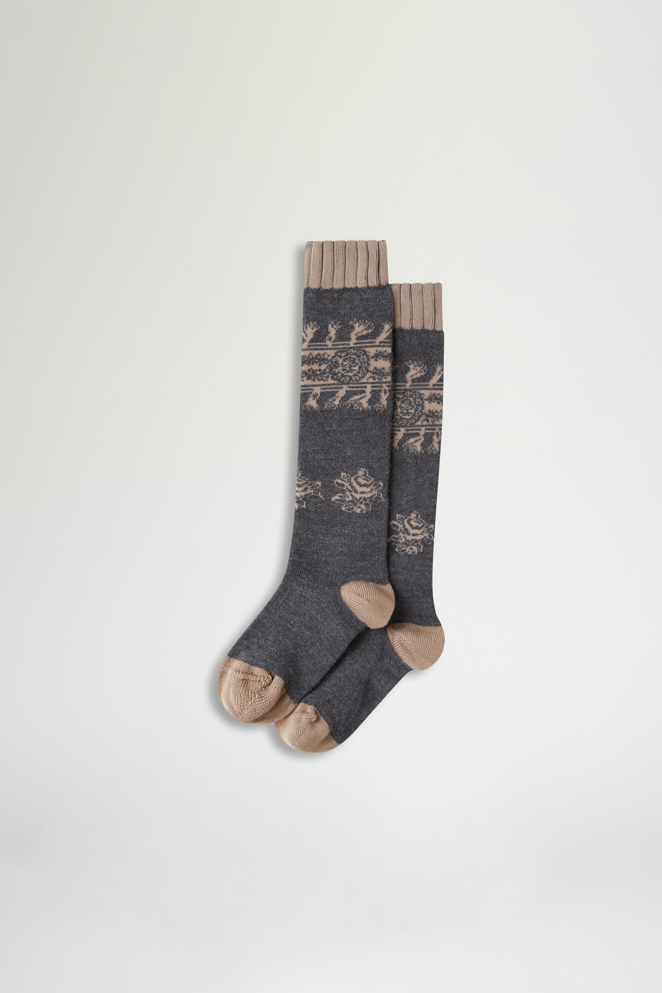• These knee-high printed socks feature a playful grey and brown folk-inspired motif with contrasting heel, toe, and cuff. Crafted from a soft wool blend, they offer warmth, comfort, and a touch of whimsy.