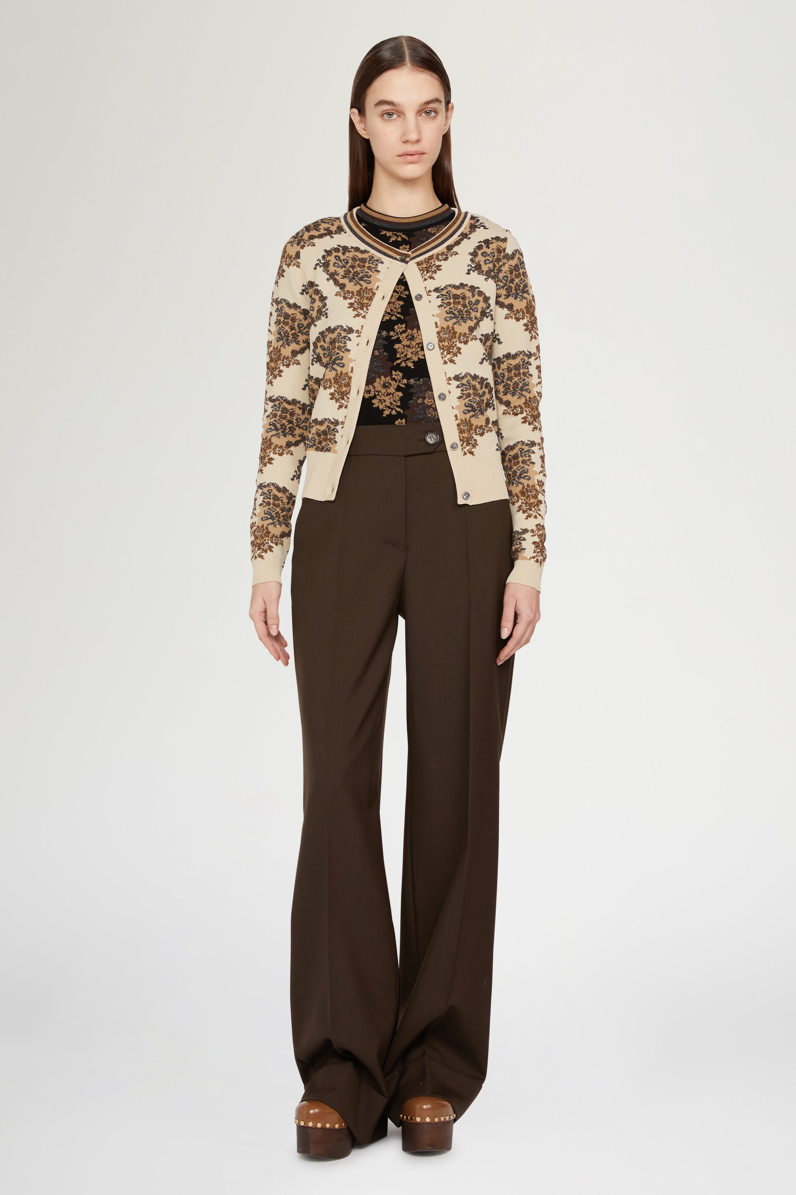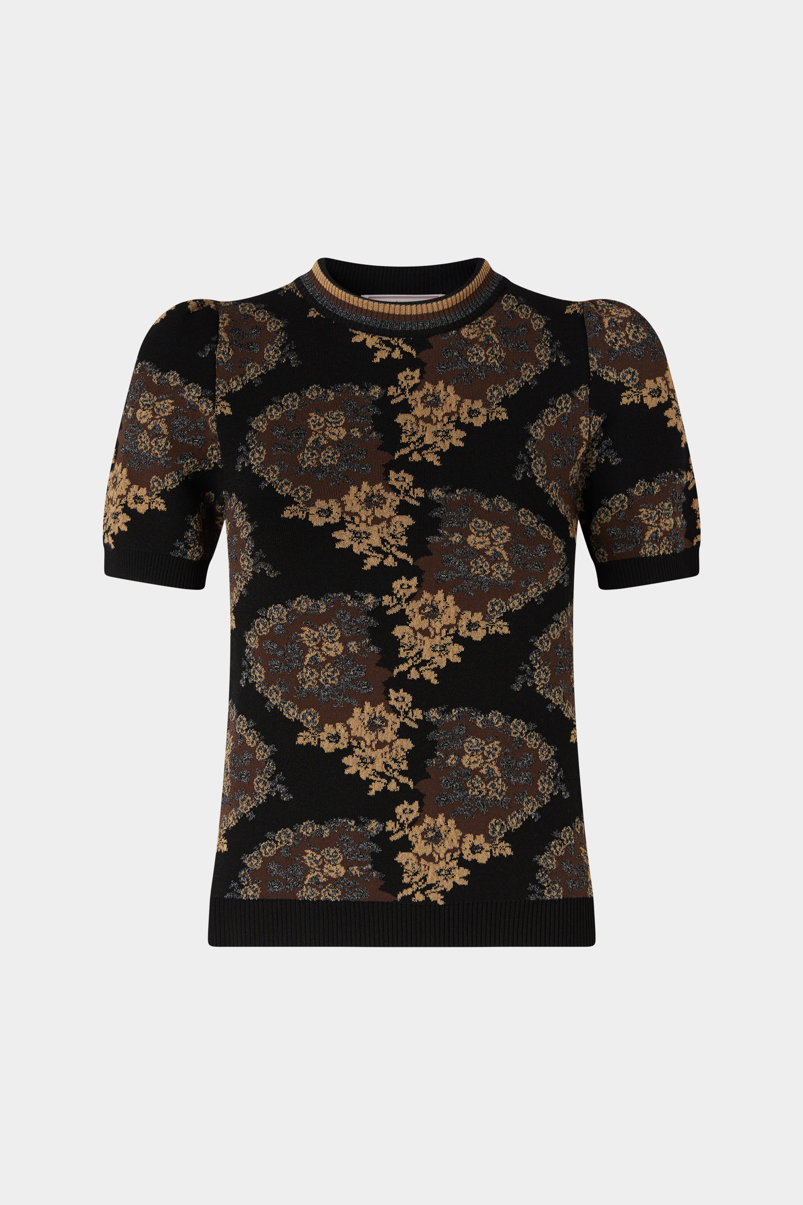 Elegant top crafted from fine knit with short sleeves and a fitted silhouette. Featuring a rich jacquard floral pattern in warm earthy tones, it’s finished with ribbed trims and a contrast neckline.
