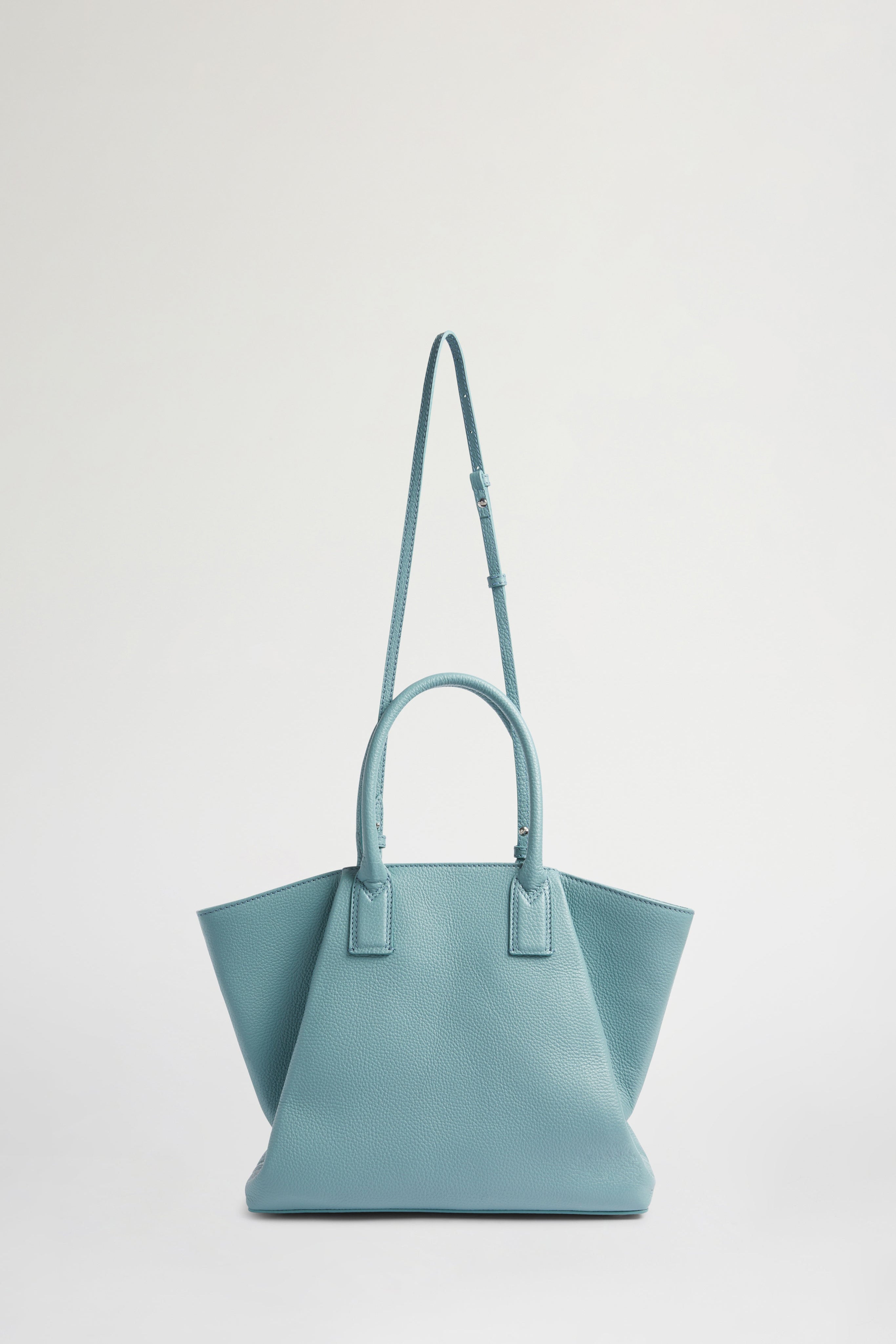 The Alma Medium bag blends refined design with artisanal detail. Crafted from deer-printed calfskin in light blue color, it features a detachable strap and a structured trapeze shape. Finished with hand-waxed edges, contrast waterproof lining, and a stamped logo.