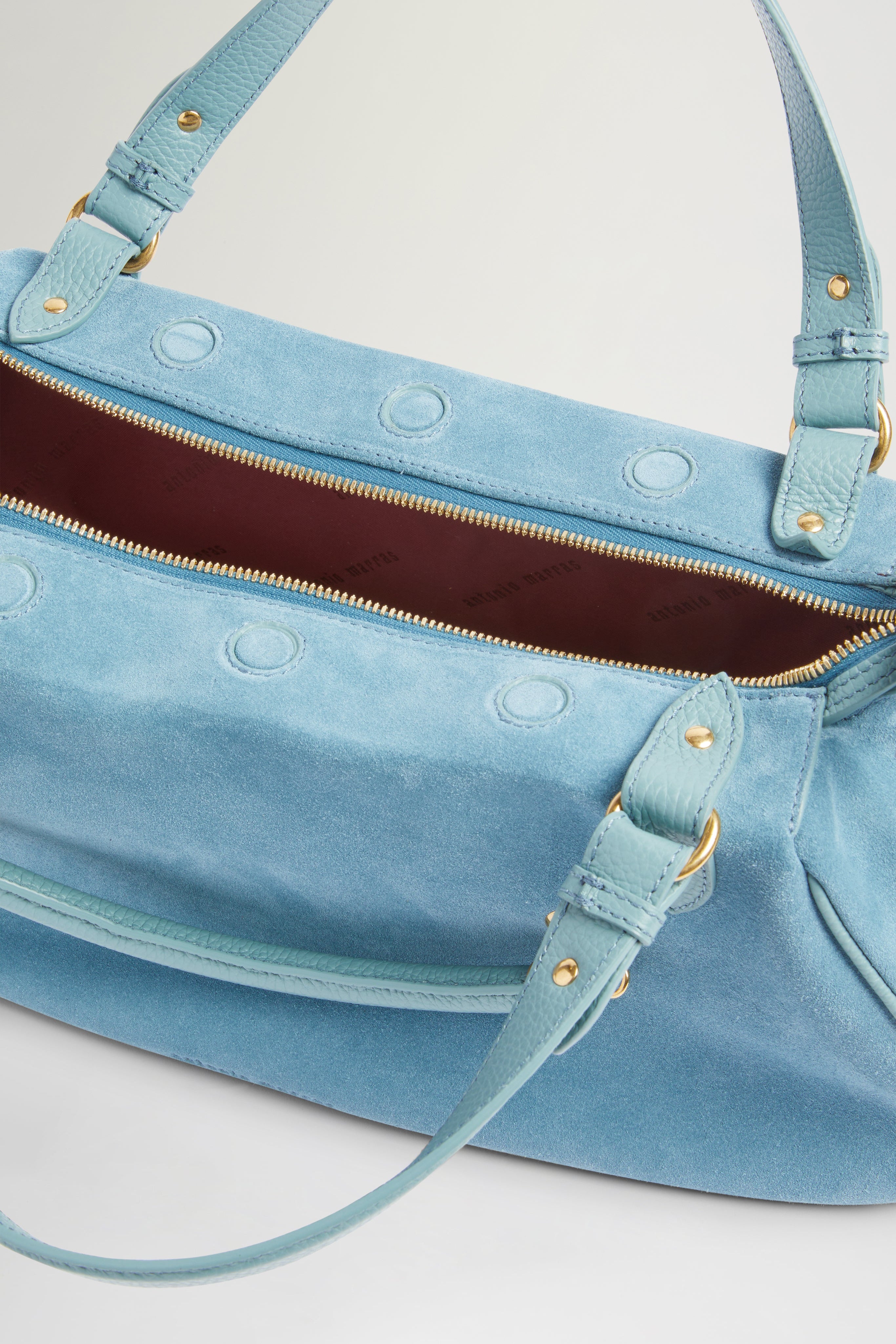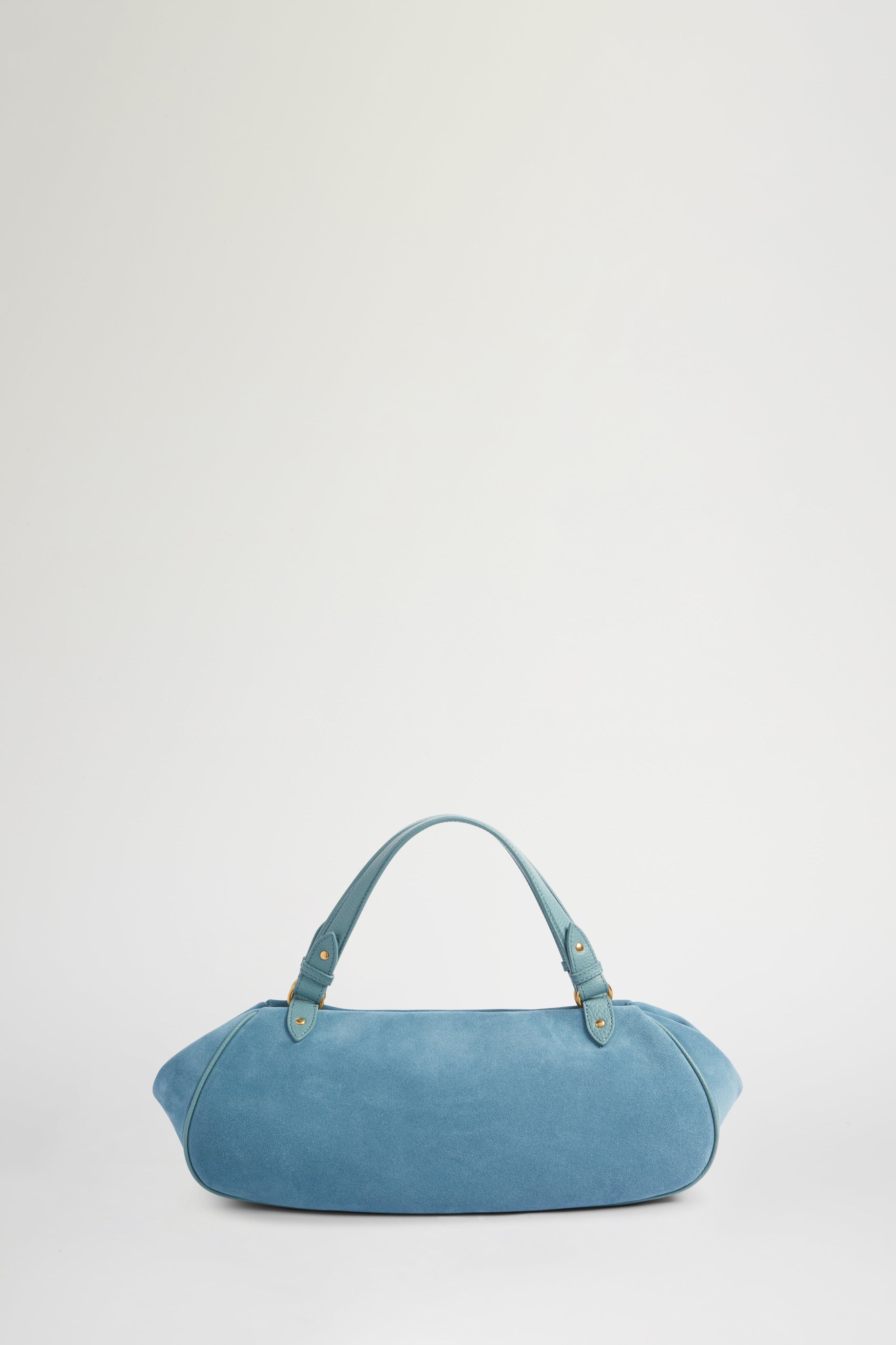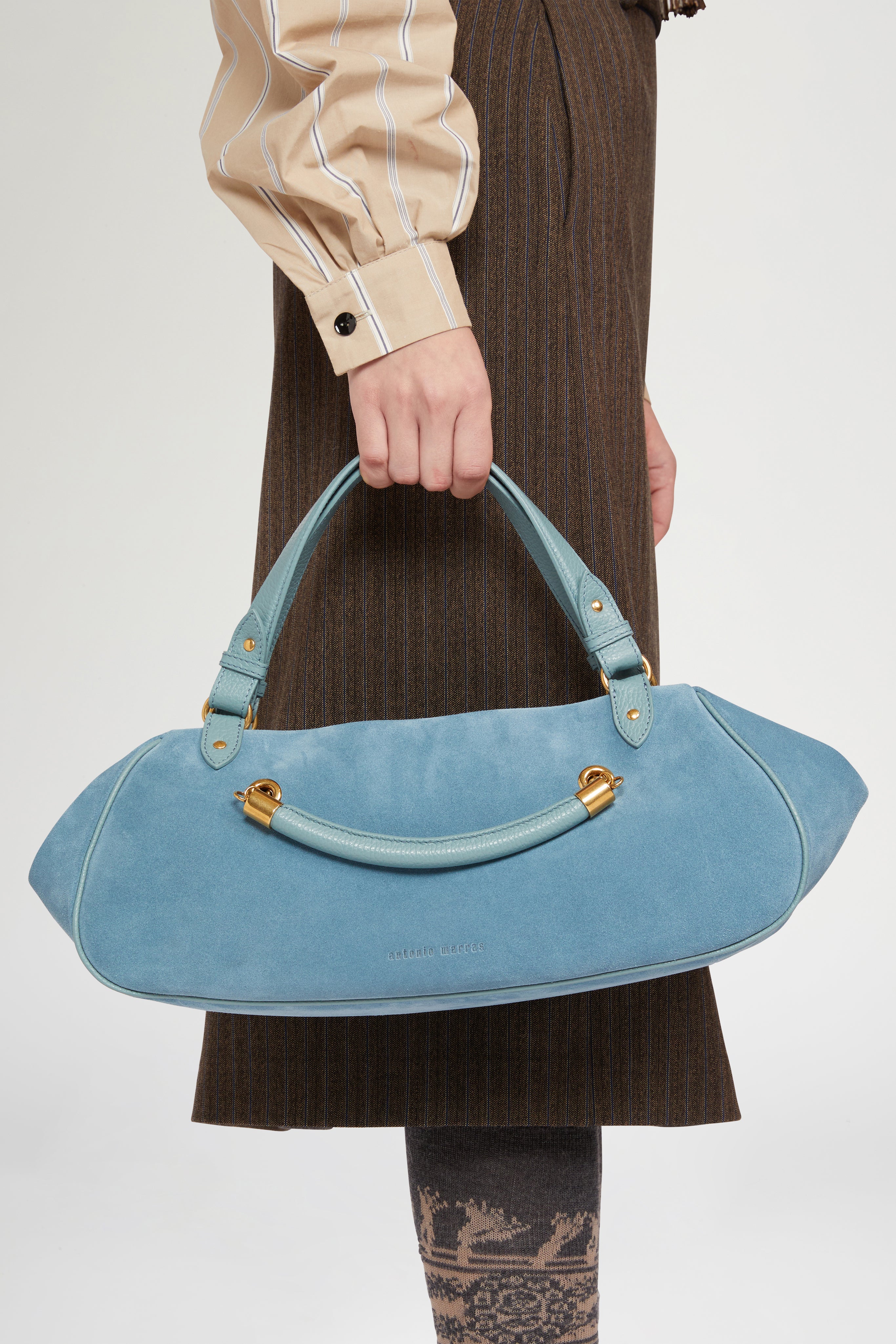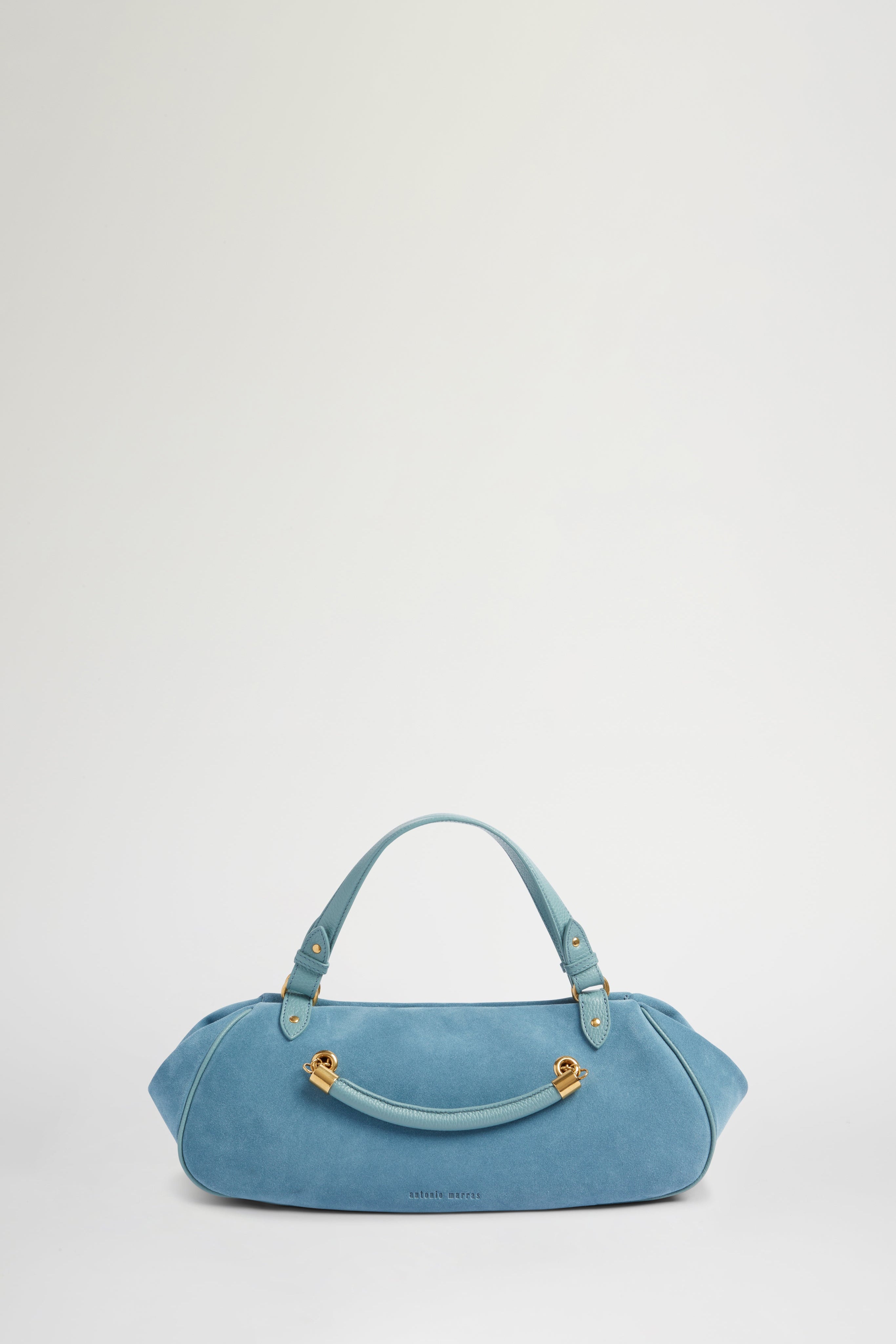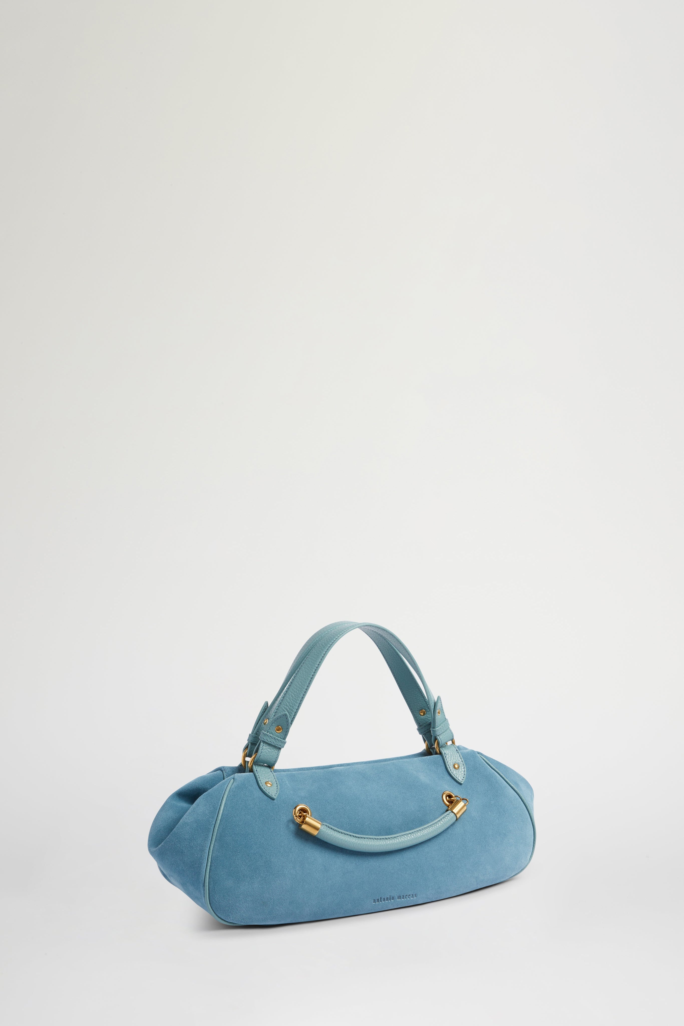 Elegant bowling bag in light blue suede leather with gold hardware and curved silhouette.