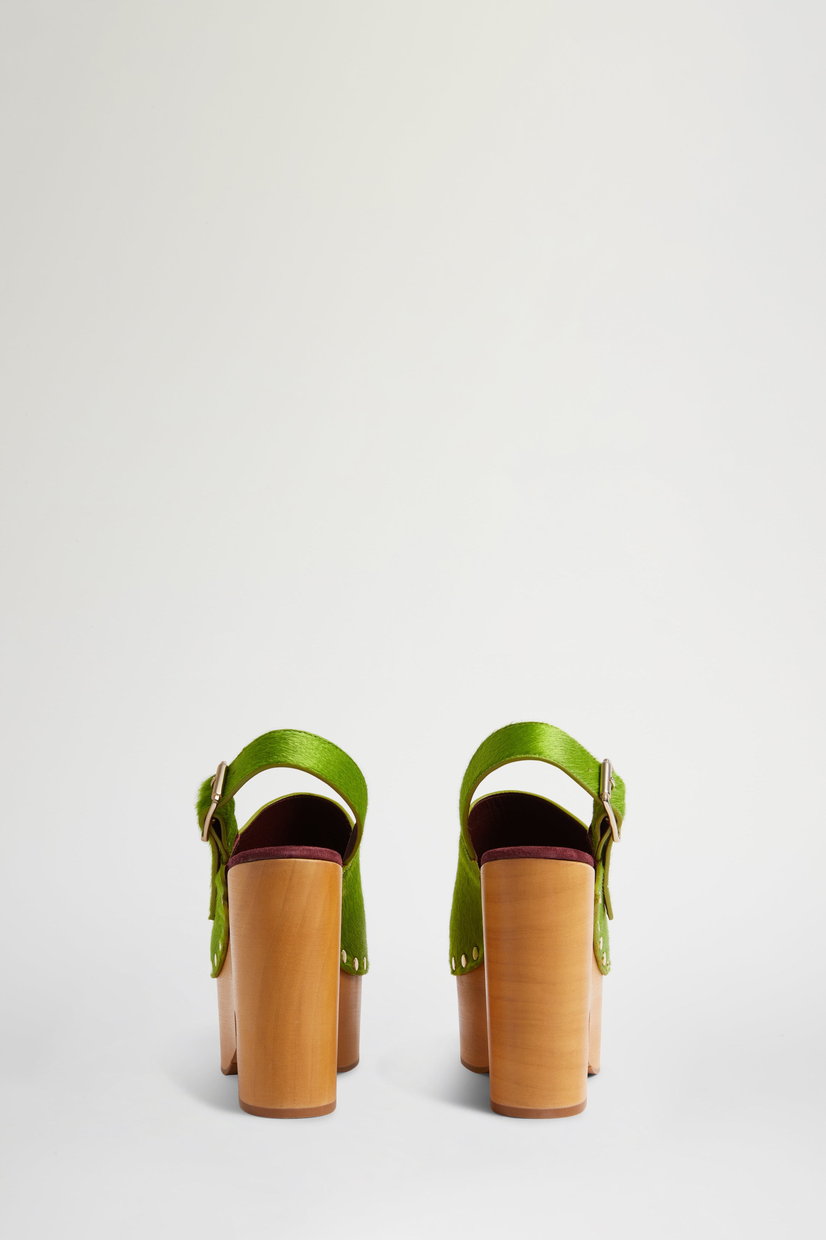 High clog mule in acid green pony-effect leather with adjustable slingback strap and metallic studs. Set on a sculpted wooden platform with engraved heart detail for a playful touch.