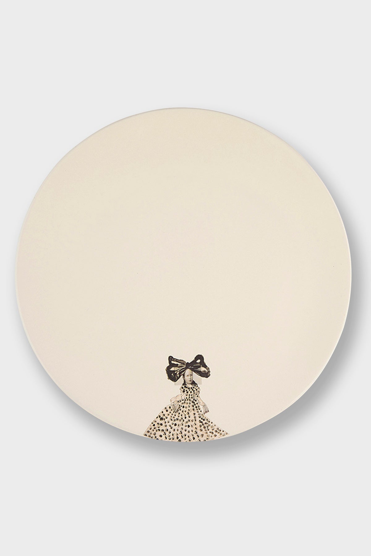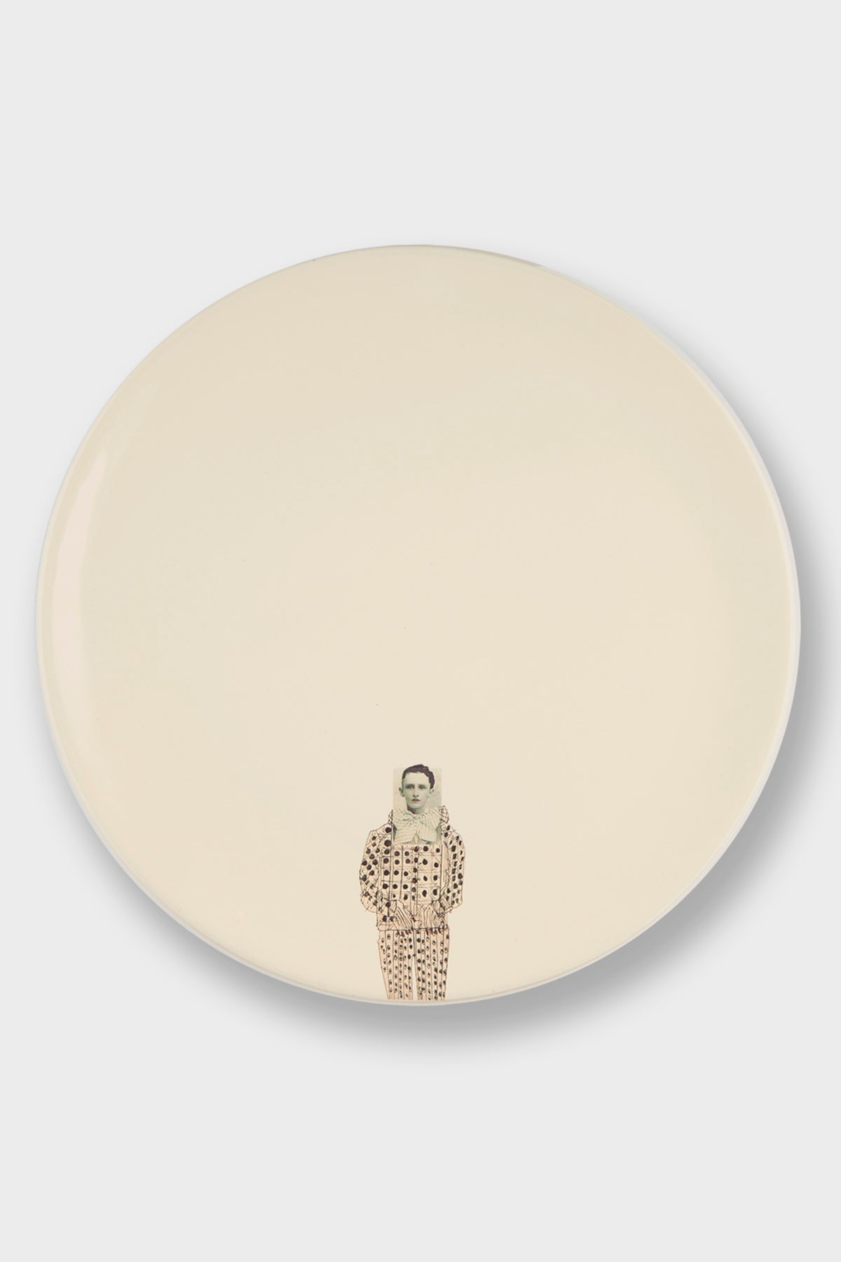 The plates, with diameter 32cm, are made from beige-glazed ceramic, with grey and black decals. -
