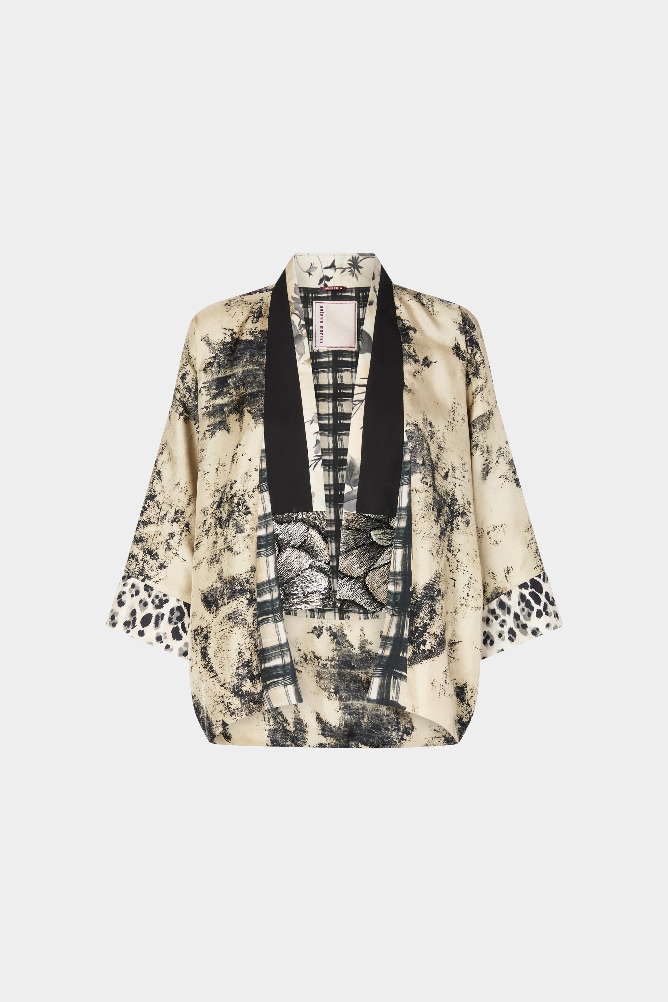 Silk kimono with a tropical and leopard print, featuring a contrast black trim and waist tie for a refined silhouette. Wide sleeves and fluid lines enhance its relaxed yet elegant appeal.